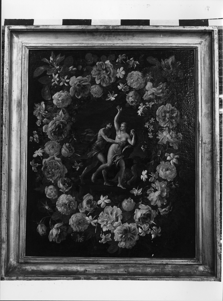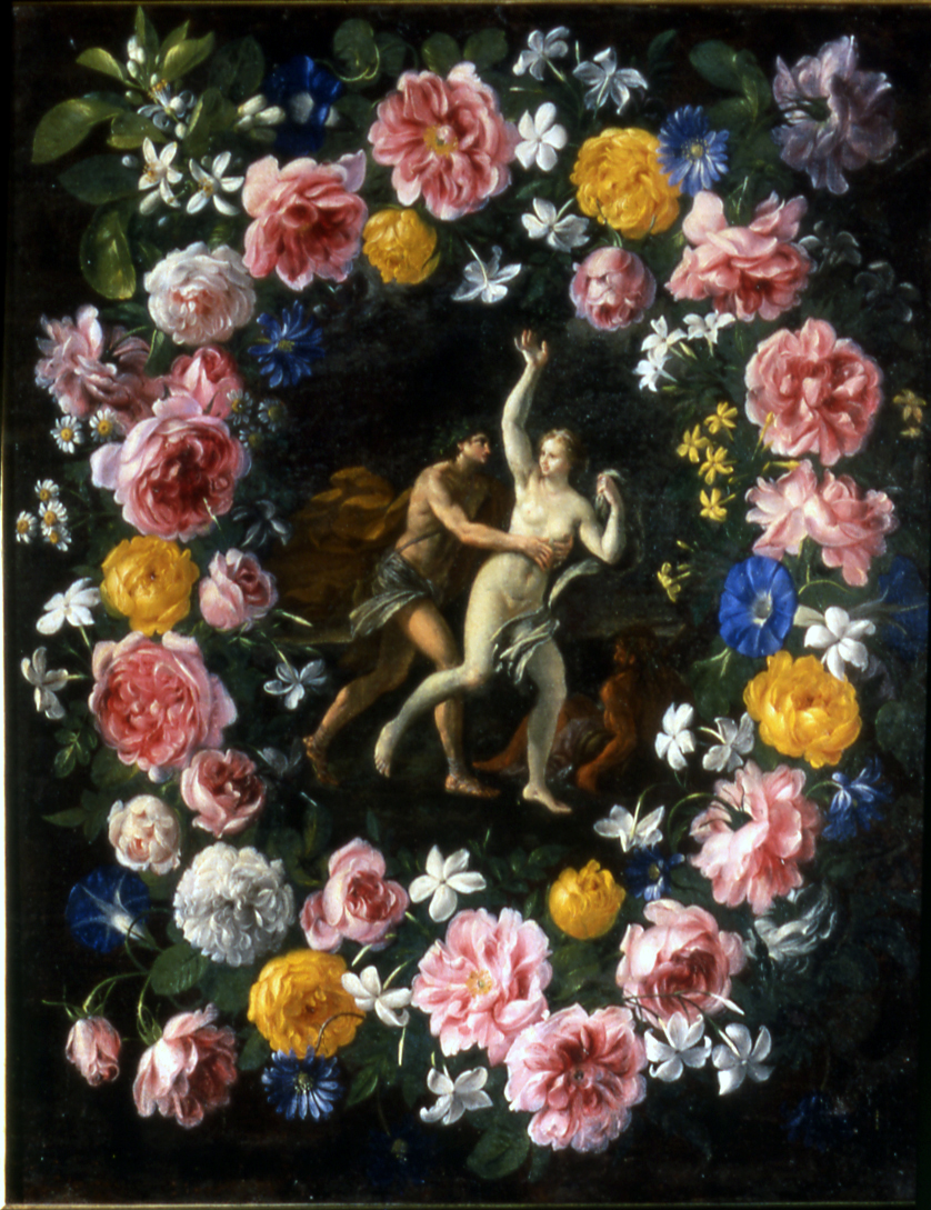 - NOTIZIE STORICO CRITICHE In pendant con dipinto inv. 258, l’opera è registrata negli inventari del 1851 e 1853 con un'attribuzione al Gobbo dei Carracci, attribuzione poi accolta da Baudi di Vesme e ancora da Noemi Gabrielli (Baudi di Vesme 1899, p. 143, e Gabrielli 1971, p. 77). Espunto dal catalogo del pittore dalla critica più recente (Cottino 1989, v. II p. 698), il quadro è attualmente esposto come opera di collaborazione fra Mario dei Fiori e Filippo Lauri, rispettivamente autori del serto floreale e delle figure. Maria Silvia Proni ha invece inserito la tela nel corpus degli Stanchi, famiglia di pittori specializzati nella produzione di nature morte, composta dai fratelli Giovanni, il più anziano, Niccolò e Antonio, autori di una produzione ben connotata e omogenea all’interno della quale risulta ancora difficile distinguere le singole mani (cfr. Proni 2005, pp. 289, 311 nota 17, e Termini 2005). L’attribuzione appare convincente alla luce delle similitudini rintracciabili con opere quali la 'Ghirlanda di fiori con santa Caterina' e la 'Ghirlanda di fiori con santa' (entrambe Mantova, collezione privata, cfr. Proni 2005, p. 290 figg. 54-55), orchestrate secondo una medesima logica compositiva e un’analoga scelta cromatica e floreale. La disposizione dell’insieme denota la ricerca di effetti decorativi più fastosi rispetto all’analisi lenticolare delle opere attribuite al solo Giovanni, facendo propendere per una datazione intorno o poco oltre la metà del secolo. Le figure di Apollo e Dafne sono di altra mano non identificata