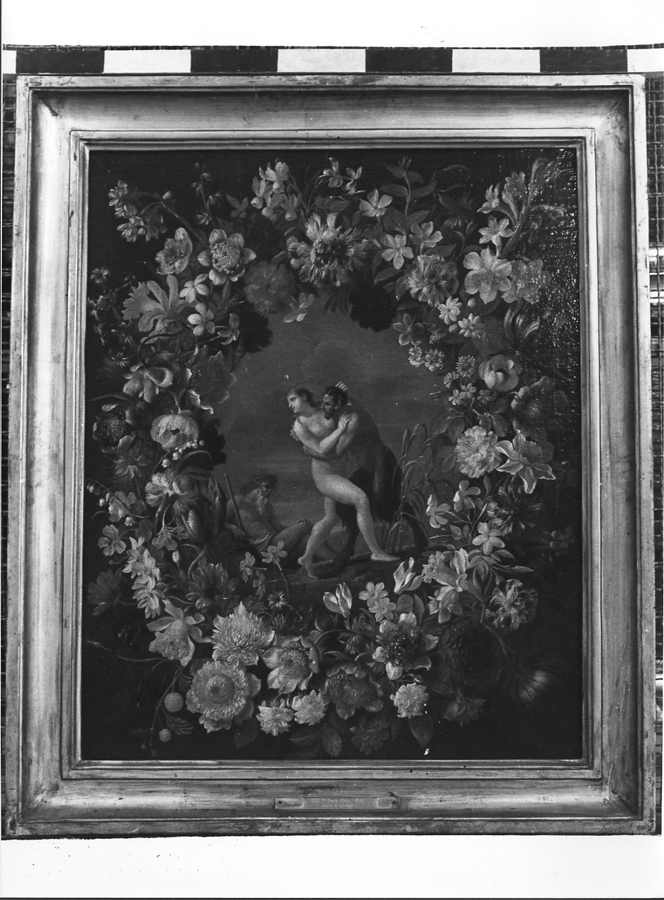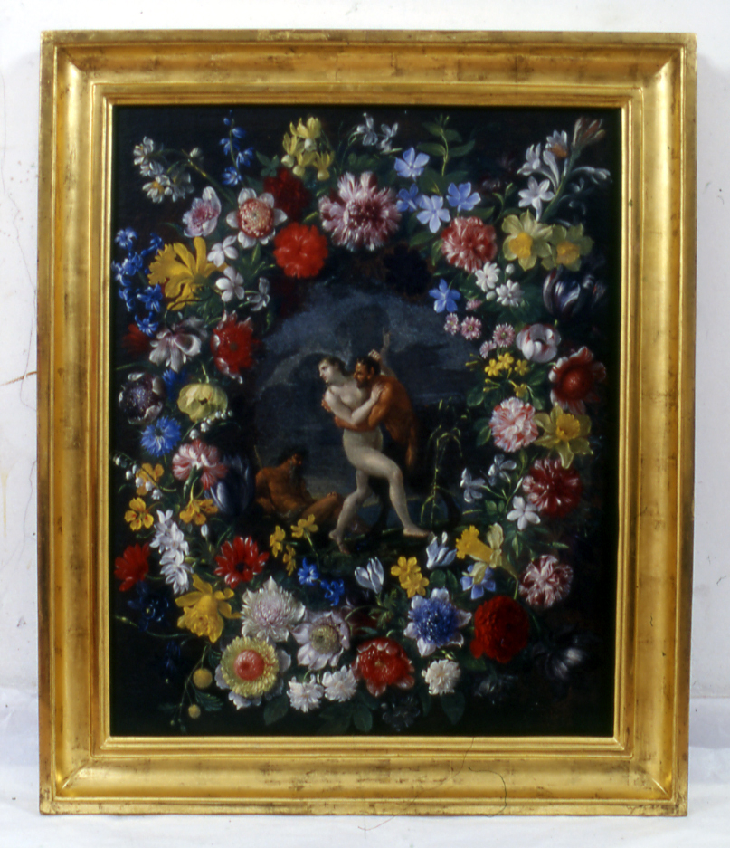 - NOTIZIE STORICO CRITICHE In pendant con dipinto inv. 607, l’opera è registrata negli inventari del 1851 e 1853 con un'attribuzione al Gobbo dei Carracci, attribuzione poi accolta da Baudi di Vesme e ancora da Noemi Gabrielli (Baudi di Vesme 1899, p. 143, e Gabrielli 1971, p. 77). Espunto dal catalogo del pittore dalla critica più recente (Cottino 1989, v. II p. 698), il quadro è attualmente esposto come opera di Filippo Lauri. Maria Silvia Proni ha invece inserito la tela nel corpus degli Stanchi, famiglia di pittori specializzati nella produzione di nature morte, composta dai fratelli Giovanni, il più anziano e a capo della bottega, Niccolò e Antonio, autori di una produzione ben connotata e omogenea all’interno della quale risulta ancora difficile distinguere le singole mani (cfr. Proni 2005, pp. 289, 311 nota 17, e Termini 2005). L’attribuzione appare convincente alla luce delle similitudini rintracciabili con opere quali la 'Ghirlanda di fiori con uccelli e farfalle' (Siena, palazzo Chigi Saracini, cfr. Proni 2005, p. 251 fig. 7) e la 'Ghirlanda di fiori' (Firenze, Gallerie, cfr. Cottino 2003, p. 351), orchestrate secondo una medesima logica compositiva e un’analoga scelta cromatica e floreale. Le opere appena citate, assegnate alla mano del solo Giovanni, denotano una ricerca analitica più accentuata rispetto alla ghirlanda della Sabauda, che rivela invece una resa delle varietà floreali più attenta all’effetto di insieme, una maggior fusione degli elementi finalizzata all’effetto decorativo complessivo. Questo la rende accostabile a opere quali la 'Ghirlanda di fiori con Madonna' di collezione privata (cfr. Proni 2005, p. 299 fig. 64) e databile poco oltre la metà del secolo. Le figure di Pan e Siringa sono di altra mano non identificata