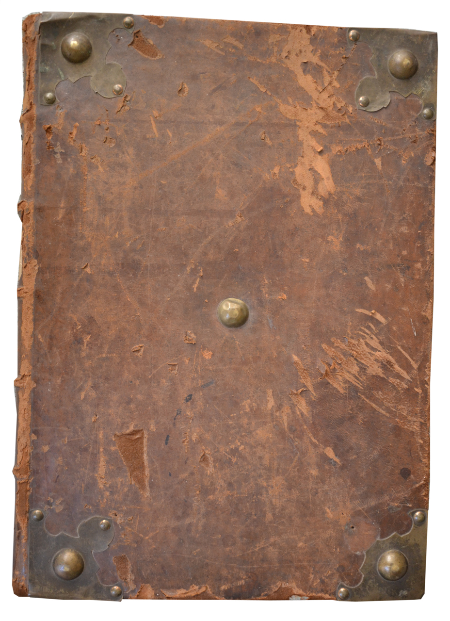 legatura rigida in pelle su supporto in cartone con ai piatti cantonali in metallo fissati con chiodi a testa tonda e umbone centrale. Dorso a cinque nervi rilevati, nella terza casella tassello con etichetta indicante il contenuto del volume. Tagli spruzzati di blu e di rosso. Segnacoli in tessuto scuro