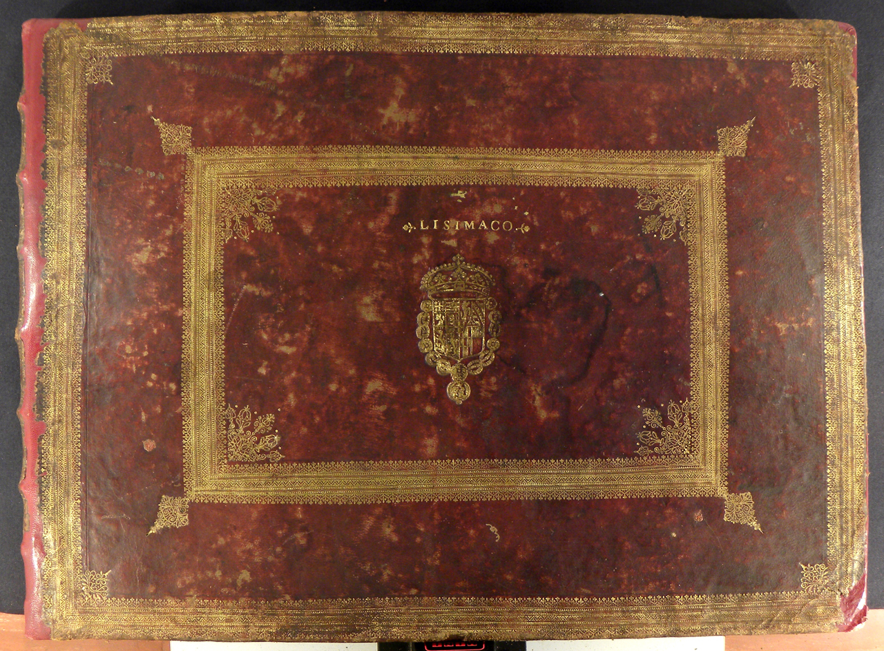legatura rigida in pelle su supporto in cartone, dorata ai piatti con cornice esterna di pizzo e doppio filetto, accantonata interna con ferro dorato; cornice dello specchio con stesso motivo, accantonata esterna con ferro dorato e interna con ventaglio; al centro dello specchio arma; al piatto superiore super libros entro gigli coronati. Dorso e angoli dei piatti di restauro in stile. Tagli dorati
