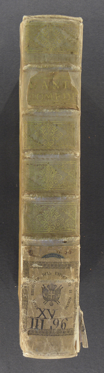legatura rigida in pergamena su supporto in cartone, decorata ai piatti con arma al centro. Dorso a sei nervi rilevati e sottolineati; caselle decorate in oro ed etichetta con autore e titolo breve applicata in seconda casella. Tagli spruzzati rossi. Note manoscritte sui fogli di guardia