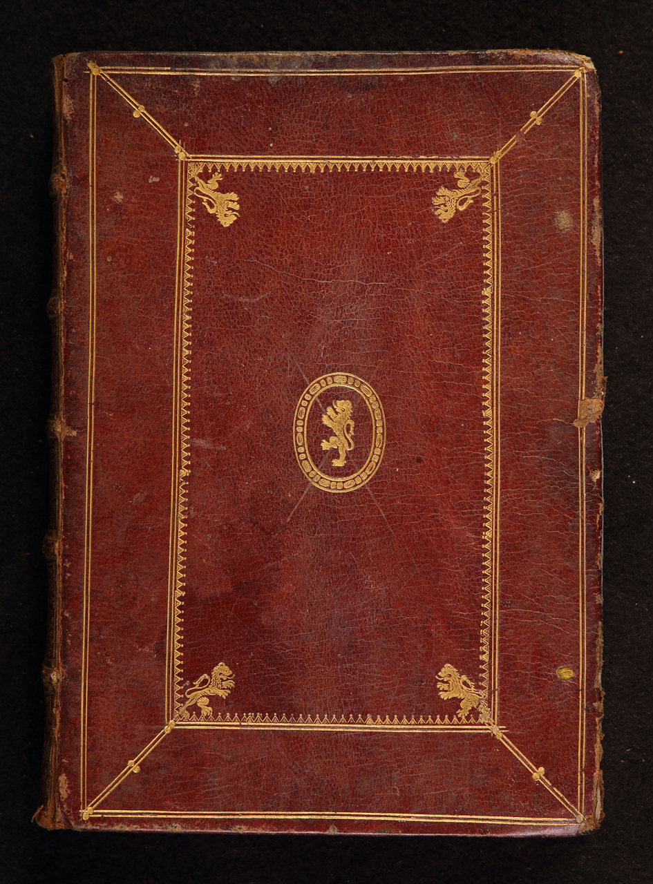 legatura rigida in pelle su supporto in cartone, dorata ai piatti con cornice esterna di doppio filetto con punto agli angoli, raccordata alla cornice dello specchio con doppio filetto interrotto a metà da punti; cornice dello specchio di doppio filetto e dente di topo con punto agli angoli, accantonata interna con leone rampante; al centro dello specchio leone rampante in cornice ovale di grossi punti in filetto. Dorso a cinque nervi rilevati, sottolineati e decorati in oro. Tagli dorati e goffrati. Tracce di chiusura in corda ai piatti. Ex-libris manoscritto sul frontespizio