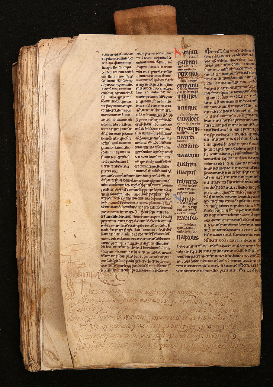 legatura floscia in pergamena manoscritta a inchiostro nero e rosso, capilettera decorati con inchiostro rosso e blu; al piatto superiore, parziale etichetta, cucitura di frammento di pergamena in testa; al piatto inferiore iscrizione manoscritta. Dorso liscio con pergamena manoscritta di rinforzo. Tagli grezzi