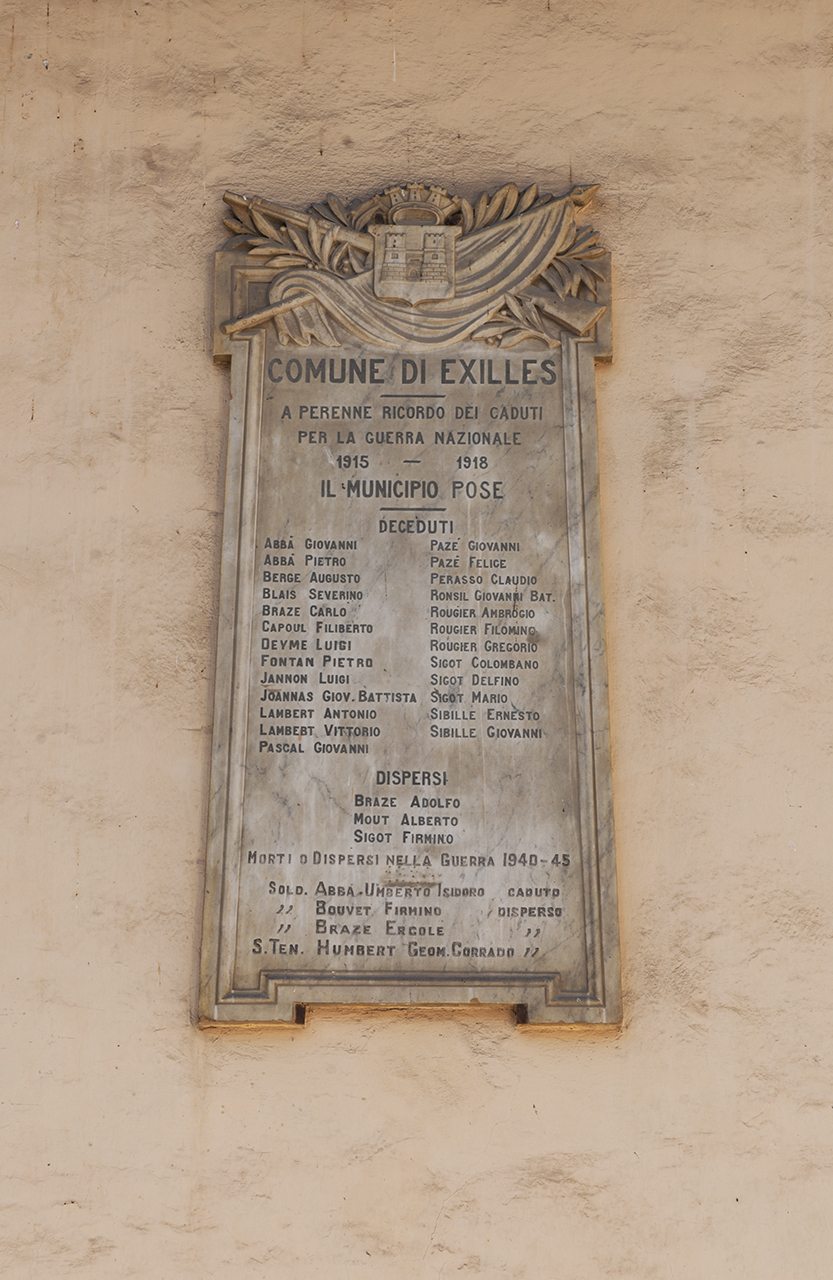 - ISCRIZIONI al centro - COMUNE DI EXILLES / A PERENNE RICORDO DEI CADUTI / PER LA GUERRA NAZIONALE / 1915 - 1918 / IL MUNICIPIO POSE / DECEDUTI / ABBÀ GIOVANNI / ABBÀ PIETRO / BERGE AUGUSTO / BLAIS SEVERINO / BRAZE CARLO / CAPOUL FILIBERTO / DEYME LUIGI / FONTAN PIETRO / JANNON LUIGI / JOANNAS GIOV. BATTISTA / LAMBERT ANTONIO / LAMBERT VITTORIO / PASCAL GIOVANNI / PAZÈ FELICE / PAZÈ GIOVANNI / PERASSO CLAUDIO / RONSIL GIOVANNI BAT. / ROUGIER AMBROGIO / ROUGIER FILOMINO / ROUGIER GREGORIO / SIGOT COLOMBANO / SIGOT DELFINO / SIGOT MARIO / SIBILLE ERNESTO / SIBILLE GIOVANNI / DISPERSI / BRAZE ADOLFO / MOUT ALBERTO / SIGOT FIRMINO / MORTI O DISPERSI NELLA GUERRA 1940 - 45 / SOLD. ABBÀ UMBERTO ISIDORO CADUTO / " BOUVET FIRMINO DISPERSO / " BRAZE ERCOLE " / S. TEN. HUMBERT GEOM. CORRADO - maiuscolo -