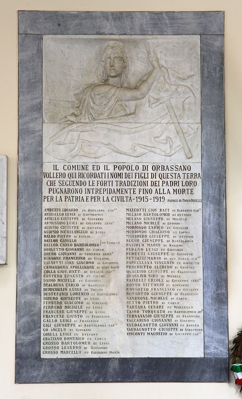 - ISCRIZIONI parte superiore - IL COMUNE ED IL POPOLO DI ORBASSANO / VOLLERO QUI RICORDATI I NOMI DEI FIGLI DI QUESTA TERRA / CHE SEGUENDO LE FORTI TRADIZIONI DEI PADRI LORO / PUGNARONO INTREPIDAMENTE FINO ALLA MORTE / PER LA PATRIA E PER LA CIVILTÀ - 1915 - 1919 - PAROLE DI PAOLO BOSELLI - maiuscolo - a incisione -