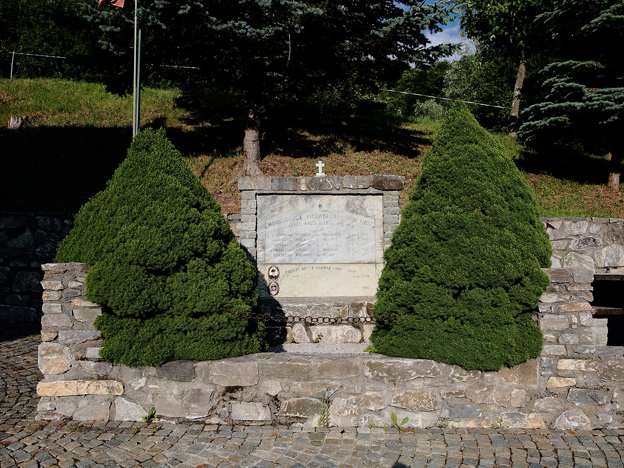 Lapide commemorativa in marmo, centinata, recante le iscrizioni relative alla prima guerra mondiale (dedica del Comune ai caduti ed elenco dei nomi). Una seconda lapide è stata aggiunta in basso con l'elenco dei caduti del secondo conflitto mondiale. La lapide è circondata da decorazioni incise a rami di quercia (a sinistra) e di alloro (a destra) ed è inserita all'interno di una cornice in pietra e muratura