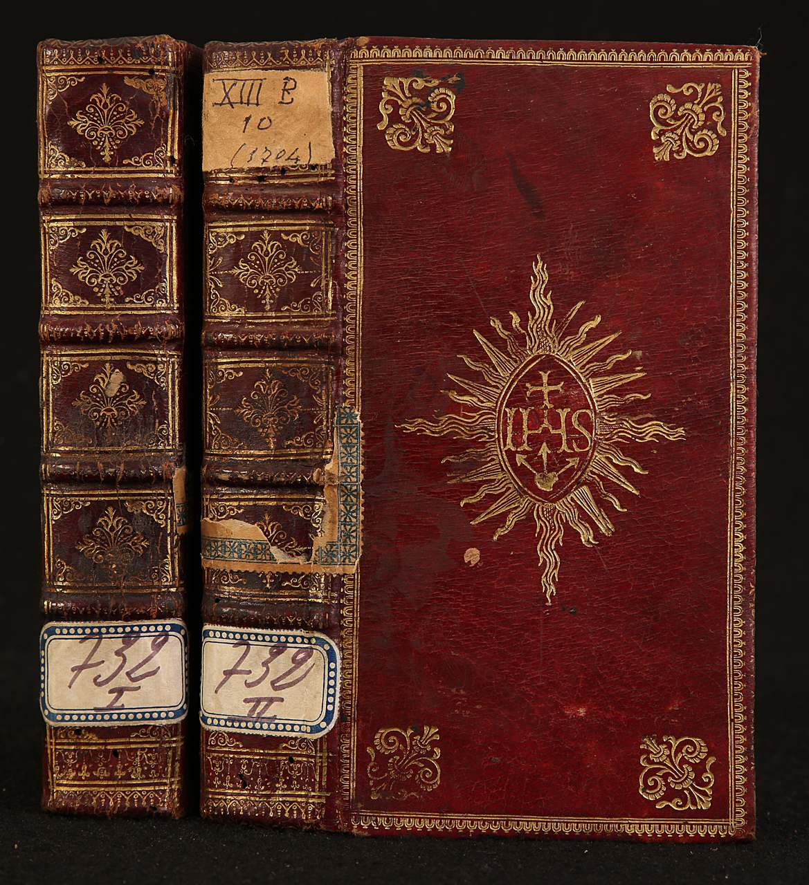 legatura rigida in pelle su supporto in cartone, dorata ai piatti con cornice dello specchio di archetti e doppio filetto, accantonata interna con motivo vegetale stilizzato e volute; al centro dello specchio arma. Dorso a quattro nervi rilevati, sottolineati e decorati in oro; caselle decorate in oro. Tagli dorati e goffrati. Labbri dorati. Guardie e controguardie in carta marmorizzata. Note ed ex-libris manoscritti non identificati sul frontespizio