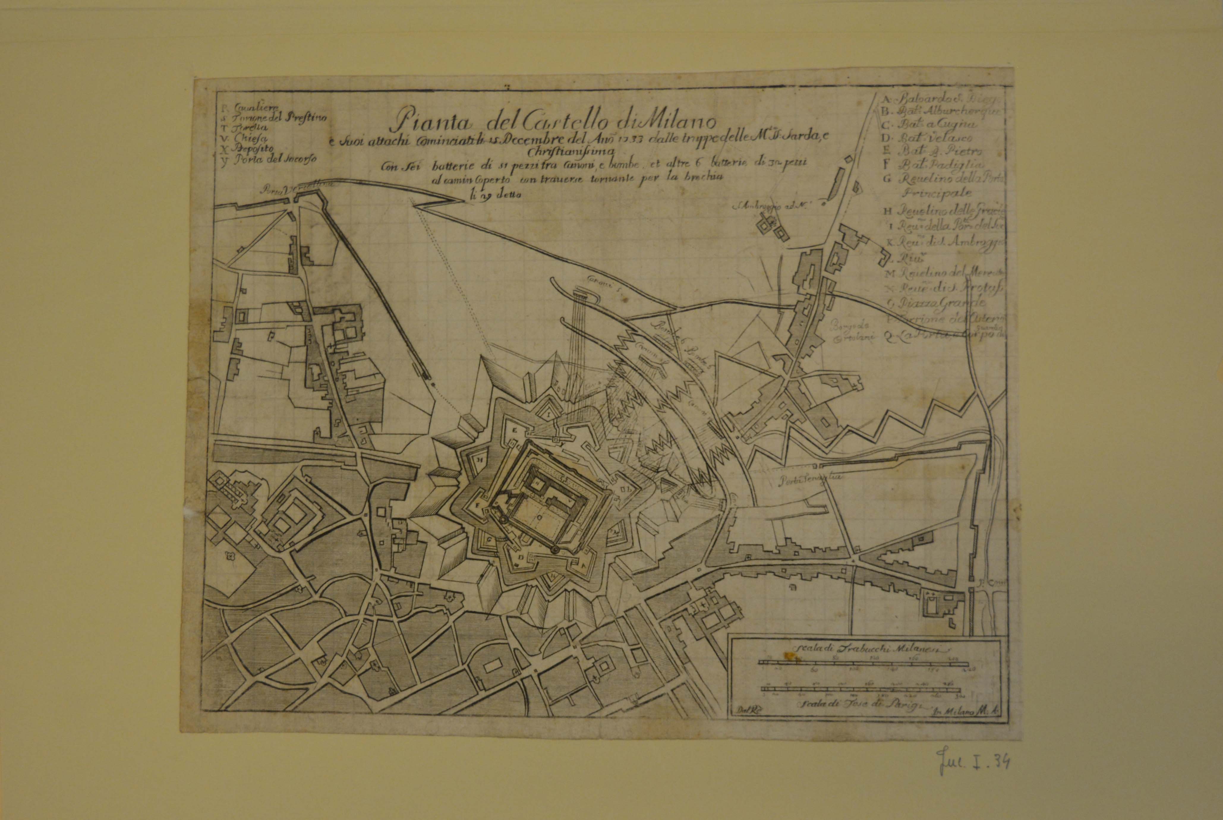 Pianta del Castello di Milano e Suoi attachi Cominciati li 15 Decembre del Anno 1735 dalle truppe delle Maestà S.S. Sarda e Christianissima. pianta dell'assedio del castello di Milano, nel 1733-1734, da parte delle truppe franco-piemontesi