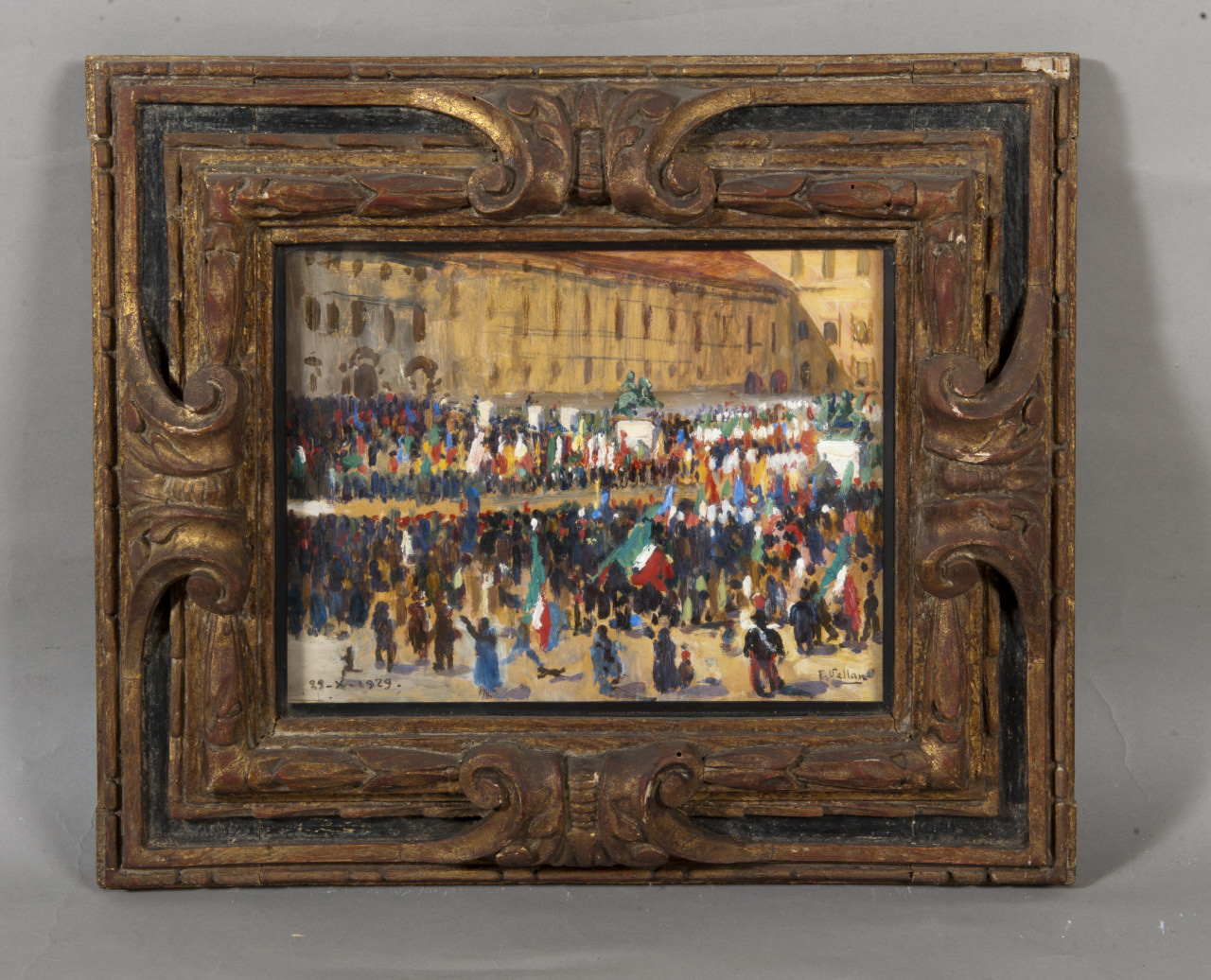 Piazza antistante a Palazzo Reale con folla acclamante che si avvia al balcone centrale del Palazzo. Cornice di legno intagliato, con motivo ornamentale sul profilo e a mezzo di ciascun lato, di legno dorato con profili interni di colore scuro e qualche ammanco soprattutto localizzato nell'angolo superiore destro. Cornice con vetro