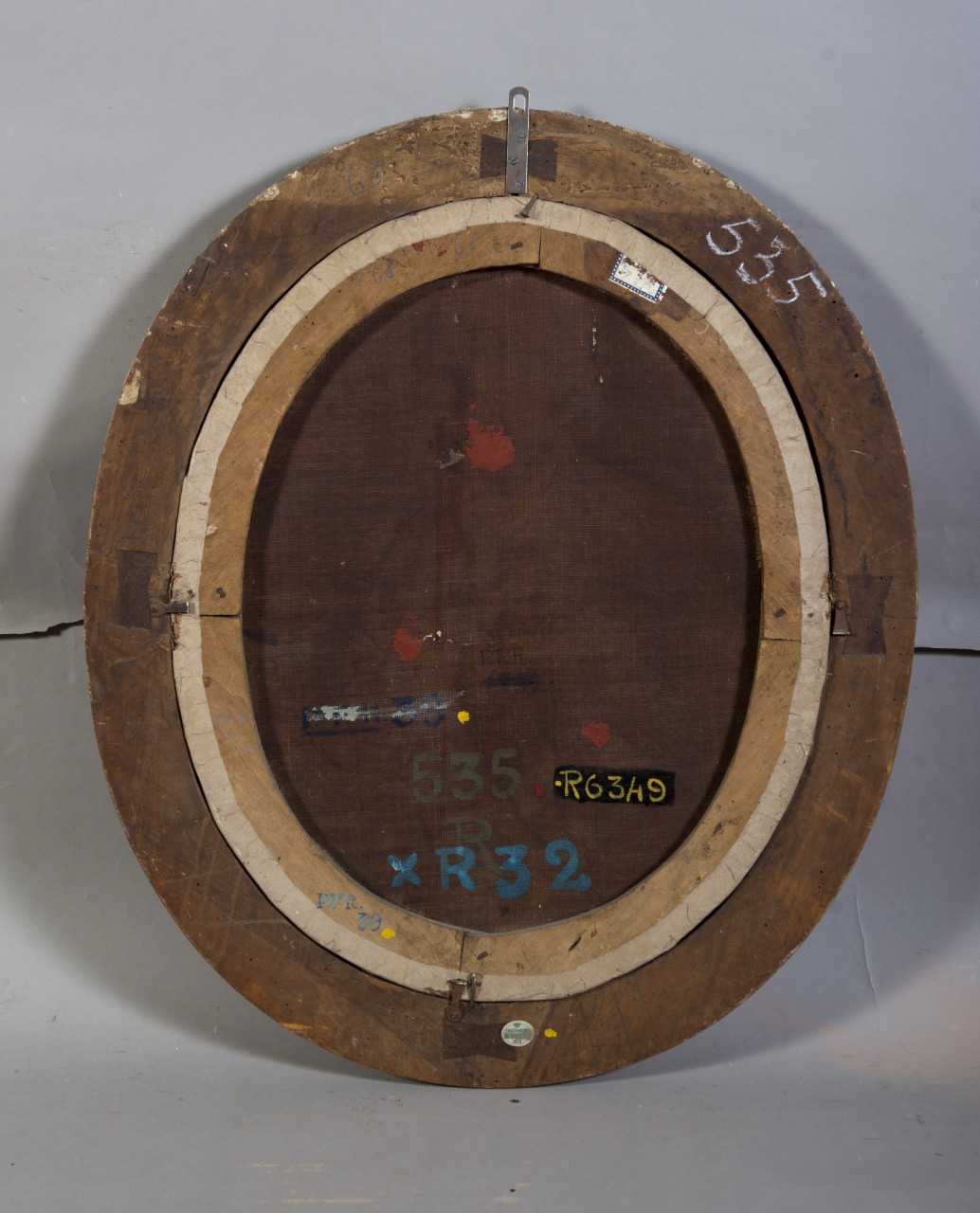 Ritratto maschile in piedi a 1/2 figura circa, testa leggermente volta a sinistra con parrucca chiara. Indossa una divisa militare scura con bordi rossi ricamati in argento, adorna di spalline, alamari e del collare dell'Ordine della SS. Annunziata. Tiene la mano sinistra infilata nel corpetto dell'abito chiaro e l'altra appoggiata al fianco. Cornice di legno intagliato e dorato all'ingiro con alcune cadute della doratura e preparazione rossa a vista e alcuni punti di fragilità