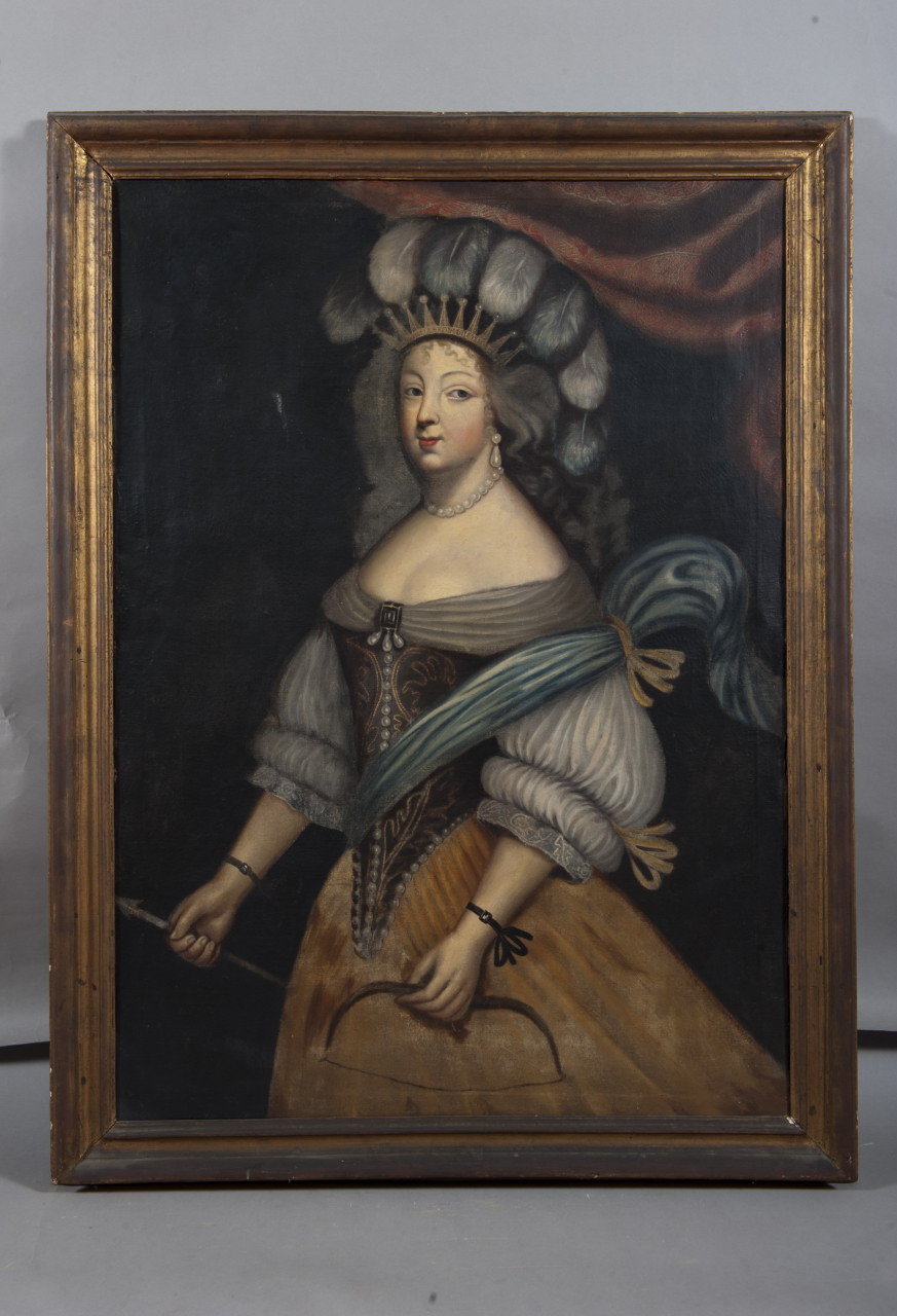 Ritratto femminile in piedi, a 3/4 di figura, testa volta leggermente verso destra con corona e copricapo piumato. Indossa un abito da cacciatrice con il corpetto scuro e guarnito di perle, attraversato da una sciarpa azzurra, le maniche chiare e la gonna di colore giallo. Indossa collana di perle, orecchini e preziosi annodati ai polsi da un nastrino nero. Tiene nella mano destra una freccia e nella sinistra l'arco. Cornice di legno dorato con qualche scrostatura