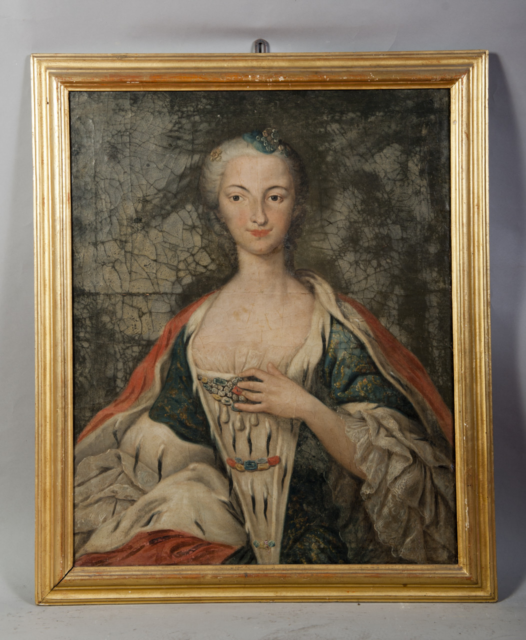Ritratto femminile a 1/2 figura, testa di fronte con acconciatura impreziosita da monili di varia foggia. Indossa un vestito probabilmente azzurro o verde con ricami in oro, inserti di pelliccia di ermellino e guarnito di altri preziosi con perle a goccia. Sulle spalle porta il manto rosso foderato anch'esso di ermellino. Tiene la mano sinistra all'altezza del petto. Cornice di legno dorato con alcune cadute della doratura