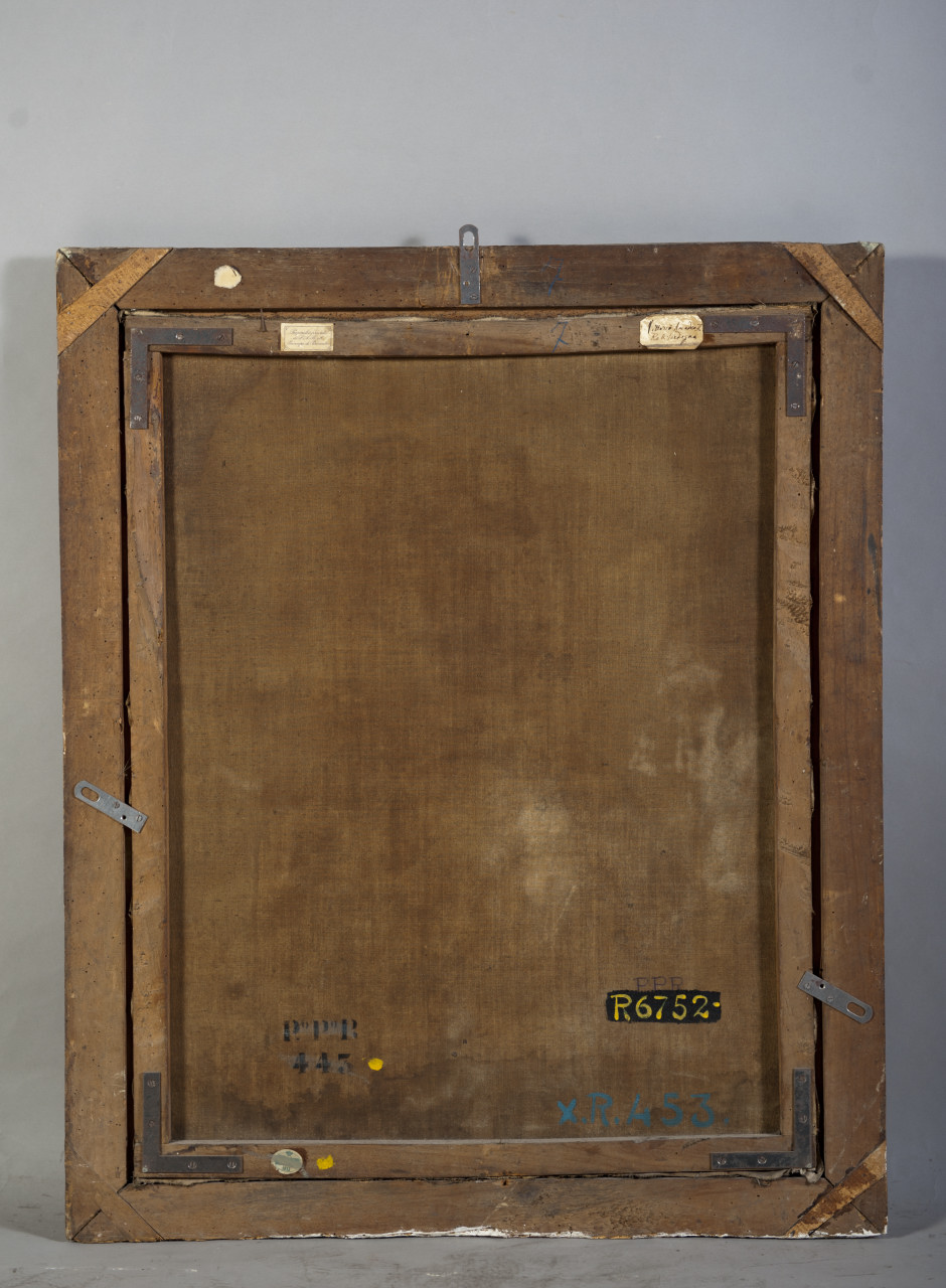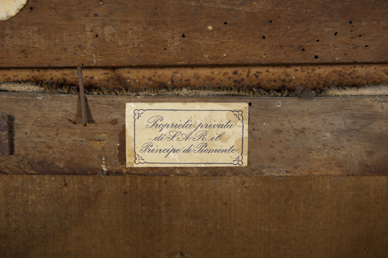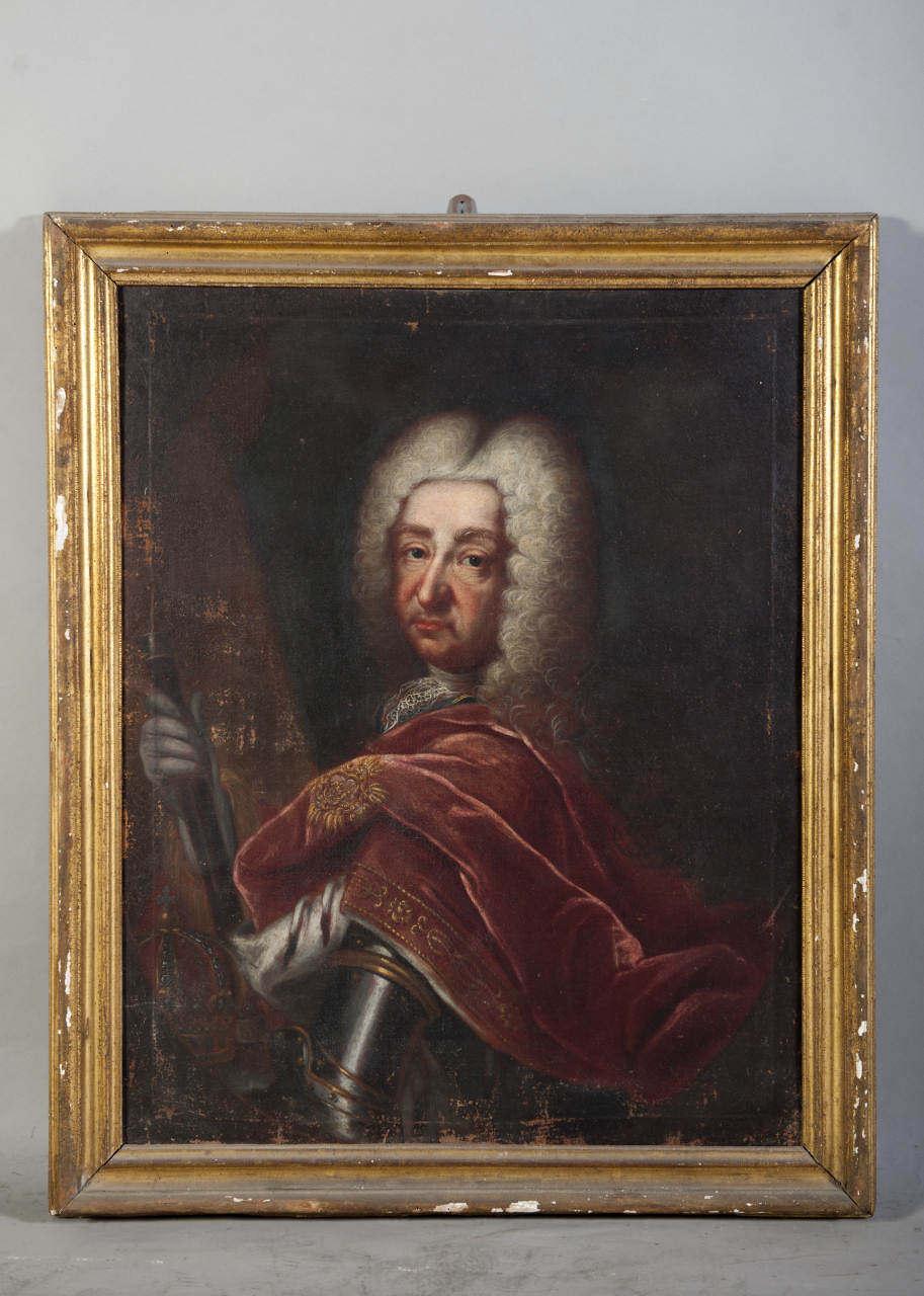 Ritratto maschile a 1/2 figura di profilo, con testa quasi di fronte con parrucca chiara e sguardo rivolto verso l'osservatore. Indossa una corazza con profili aurei, una camicia chiara e un manto di rosso con ricami in oro a nodi sabaudi e fodera di ermellino. Tiene ilbastone del comando nella mano destra, che calza un guanto. Il braccio sinistro è probabilmente poggiato al fianco. Sullo sfondo a sinistra s'intravede la corona reale. Cornice di legno dorato con numerosi ammanchi e cadute del colore