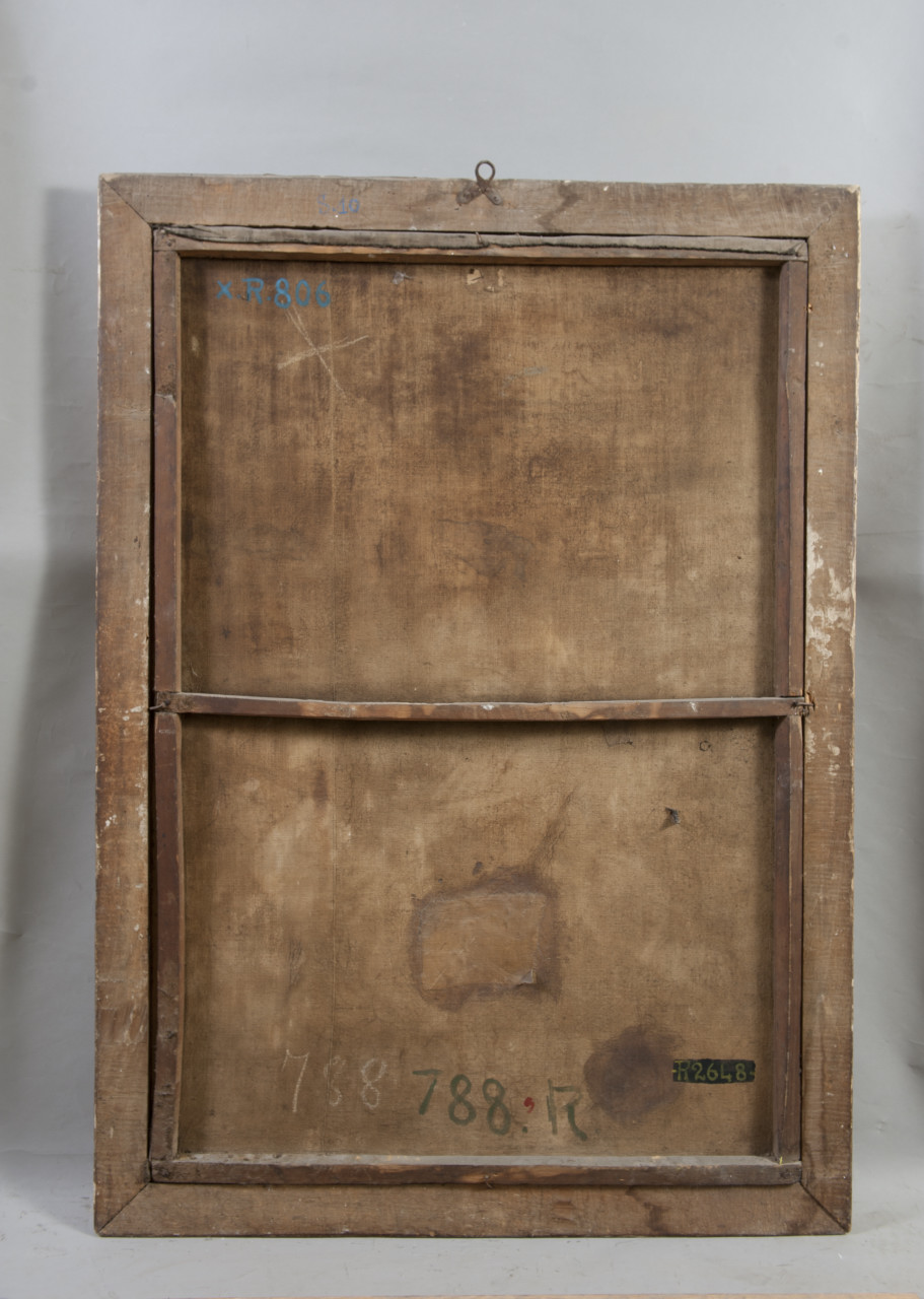 Ritratto maschile sopra un cavallo bianco impennato, testa rivolta verso sinistra con cuffia rossa. Indossa una divisa di caporale degli Zuavi. Sullo sfondo il trasporto di un ferito e il seppellimento di morti, sulla destra un casale in pietra. In primissimo piano alcune armi abbandonate, tra cui un fucile e un cannone. Cornice di legno dorato con profilo interno decorato e altri ornati in gesso sugli angoli e a mezzo dei lati. La cornice è rotta in diversi punti