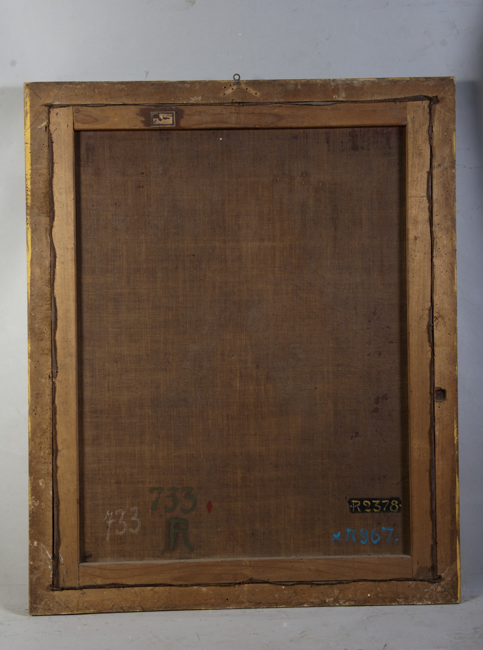 Ritratto maschile in età giovanile, in piedi a 3/4 di figura, testa quasi di fronte con parrucca chiara tenuta raccolta da un nastro sul dorso. Indossa una marsina rossa con ricami e bottoni dorati, un corpetto damascato di colore argento con bordi in oro, una camicia chiara, il collare dell'Ordine della SS. Annunziata e dei pantaloni rossi con bottoni d'oro. Porta la spada al fianco sinistro e un gioiello appuntato sulla marsina. Tiene la mano destra al fianco e con la sinistra indicare un foglio che si trova sopra una consolle a destra. Cornice di legno dorato con qualche scrostatura