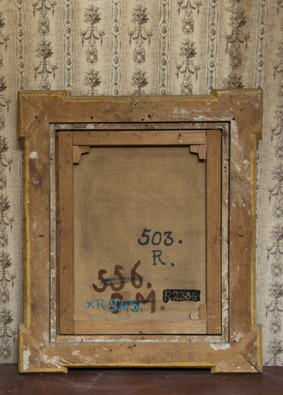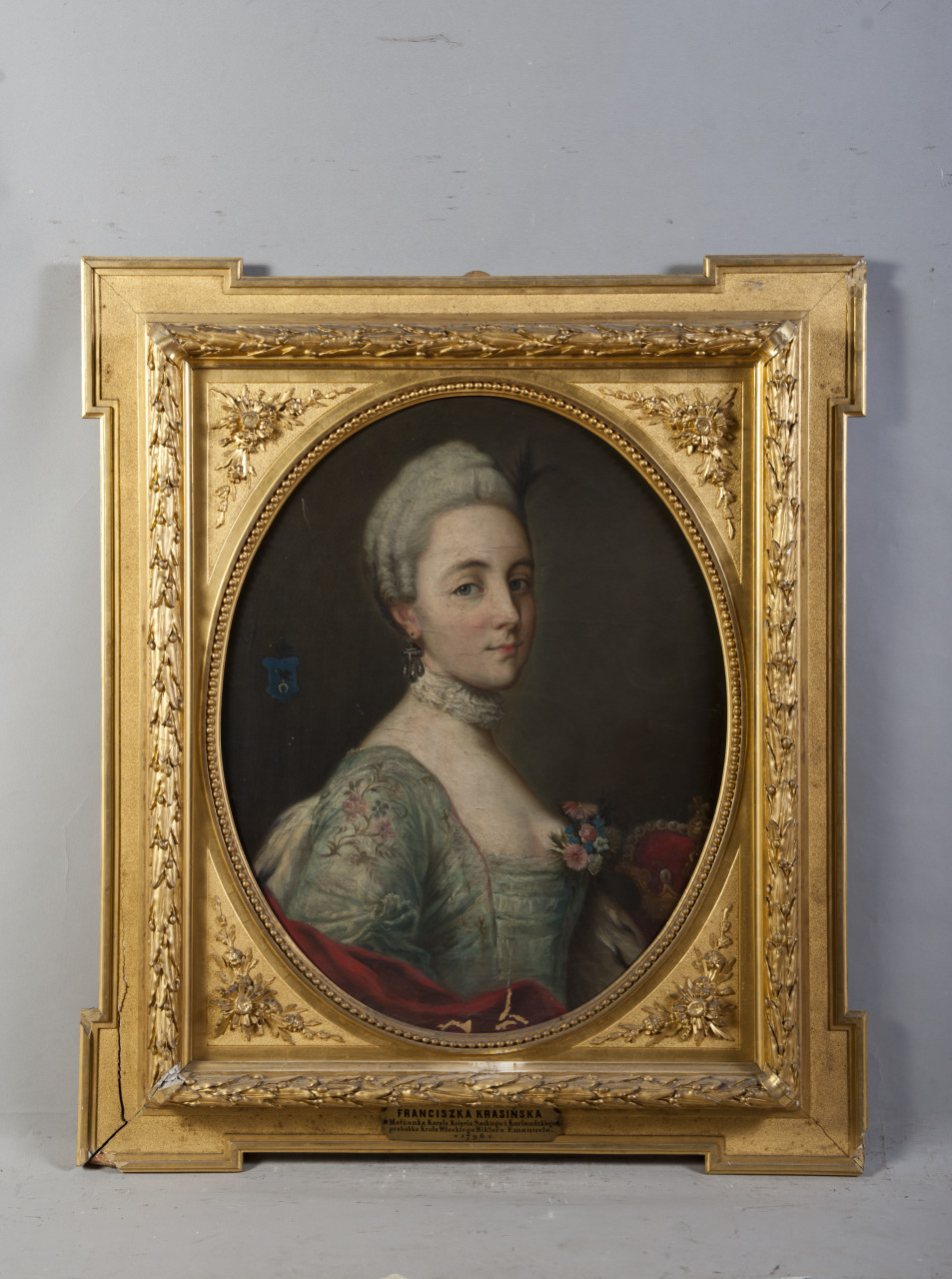 Ritratto femminile a 1/2 figura, di profilo con testa leggermente volta a destra con capigliatura grigia raccolta, piuma nera, orecchino pendente all'orecchio destro e lattuga chiara al collo. Indossa un abito di colore azzurro pallido ricamato, adorno sul petto con fiori di vari colore e il manto rosso con fodera di ermellino. Sulla sinistra è rappresentato uno stemma, probabilmente di casa Curlandia. In secondo piano sulla destra è rappresentata una corona reale. Cornice di legno dorato con ornati in gesso e interno di forma ovale