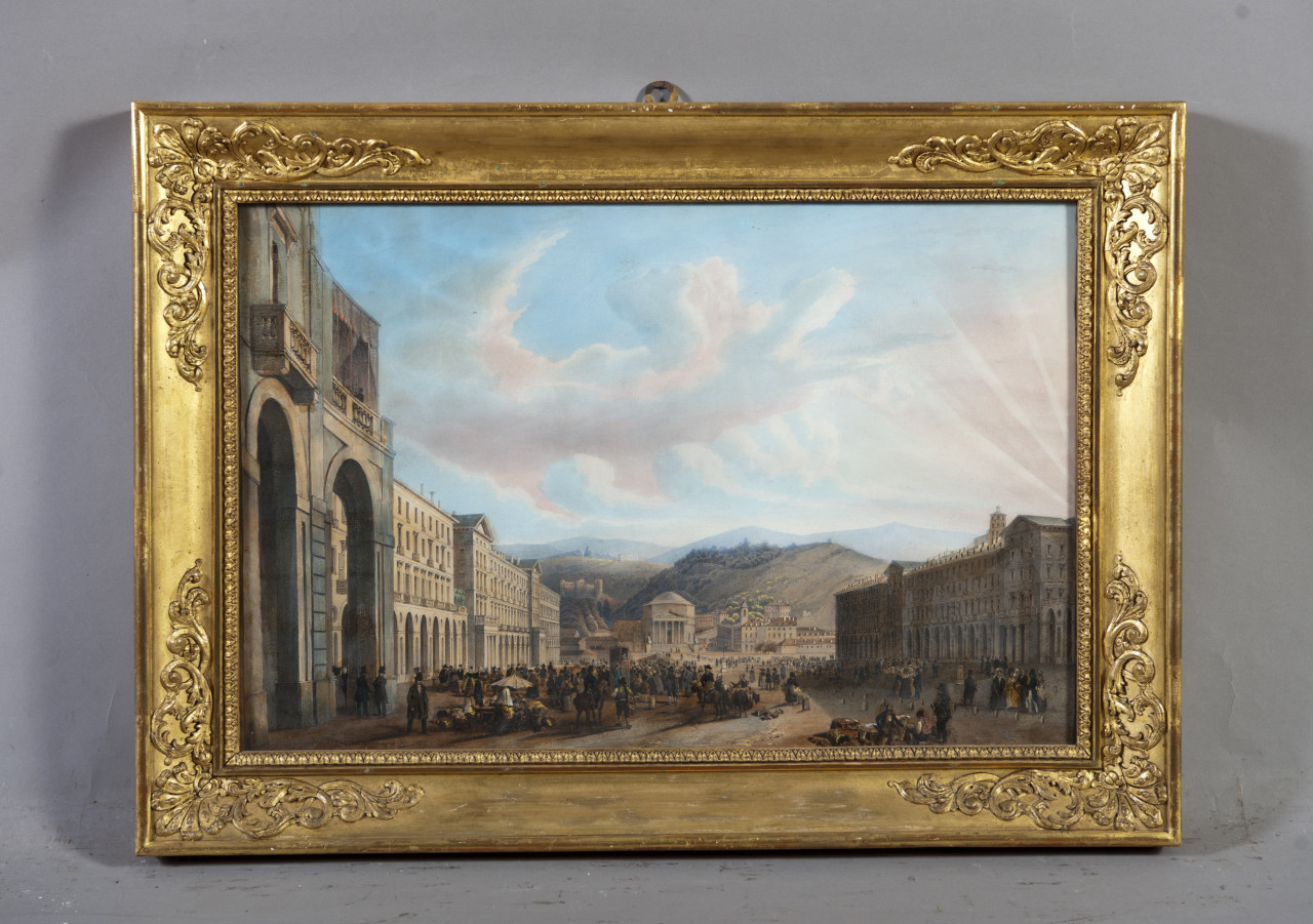 Veduta di Piazza Vittorio Emanuele I (ora Piazza Vittorio Veneto) a Torino. Cornice di legno dorata con ornati in gesso angolari e decorazioni sul profilo interno