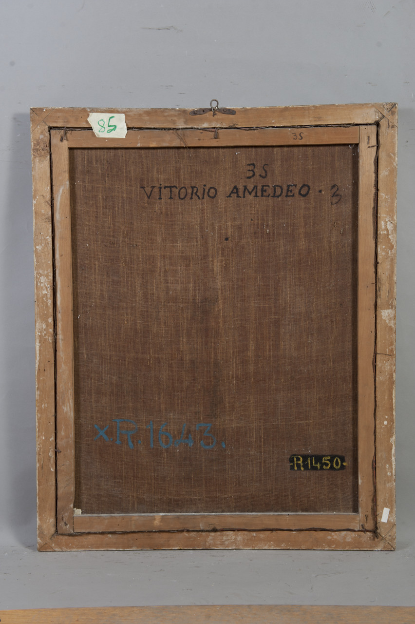 Dipinto a olio su tela di formato rettangolare, con cornice in legno intagliato, scanalato e dorato. Vittorio Amedeo III è ritratto a mezzo busto, con indosso una marsina blu dalla passamaneria in filato metallico argento. La mano destra è nascosta nel panciotto senape, la sinistra regge lo scettro, accanto alla corona appoggiata su di una console con piano in marmo bianco