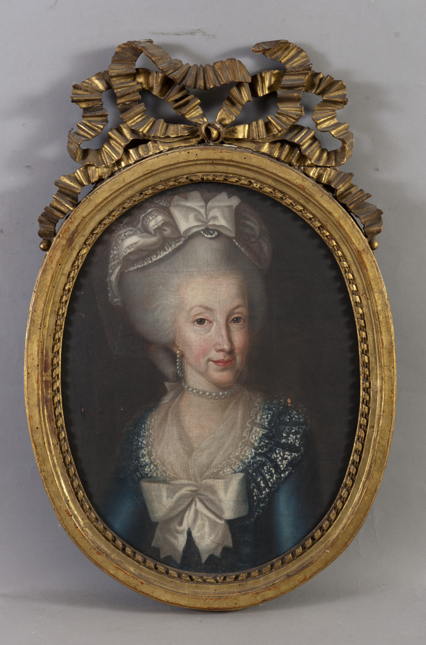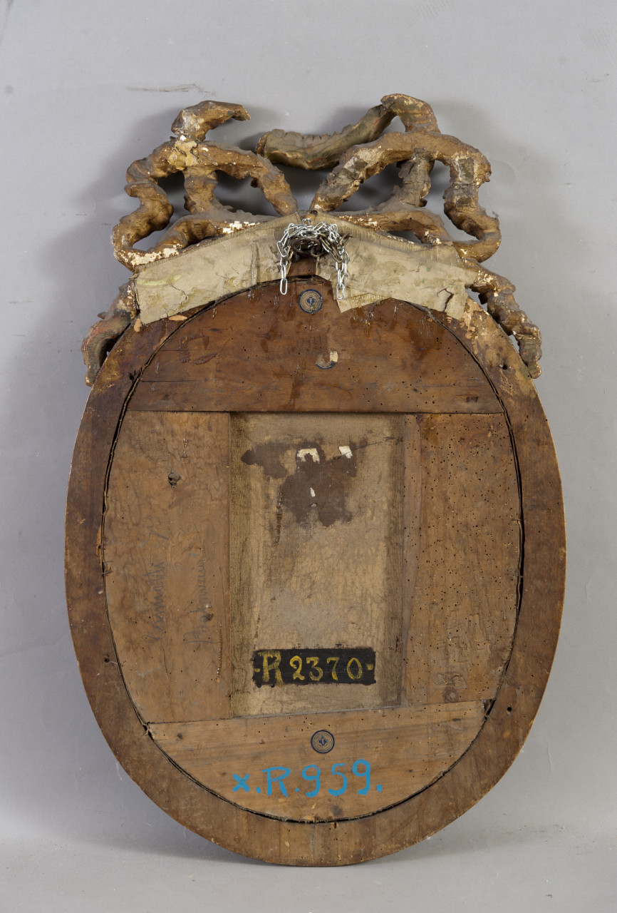 Dipinto ad olio su tela di formato ovale con cornice in legno intagliato e dorato