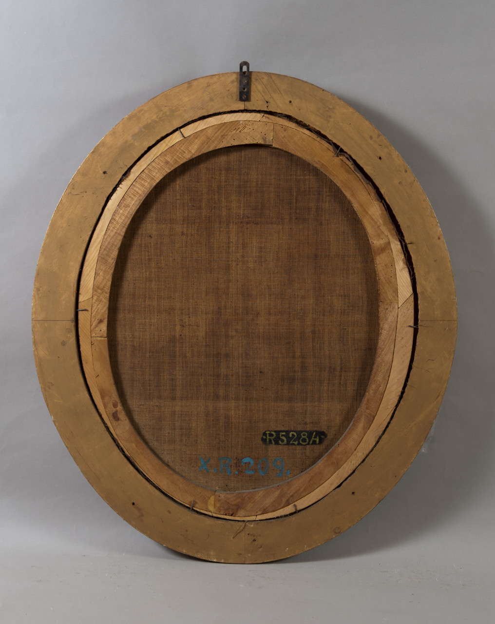 Dipinto ad olio su tela di formato ovale con cornice in legno intagliato e dorato. Una ignota principessa di Casa Savoia è ritratta a a 1/2 figura, testa quasi di fronte e mano destra al fianco, in giacca rossa guarnita da doppia fila di bottoni e di cravatta scura a farfalla con pizzo