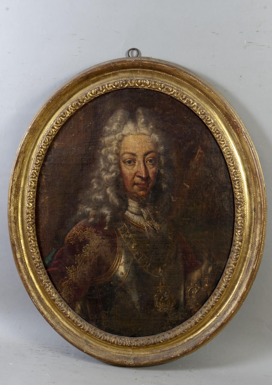 Il personaggio è rappresentato a mezzo busto, con taglio poco sopra ill punto vita, il corpo di tre quarti e il viso, frontale e maturo, con lo sguardo rivolto verso l’osservatore. Il volto è imberbe; porta una parrucca con scriminatura centrale e fluenti boccoli che discendono oltre le spalle. Indossa un petto di corazza sotto al quale è dipinta una marsina di velluto. Al collo fuoriesce lo jabot; sul petto è dipinto il collare dell’ordine dinastico della SS. Annunziata; dietro alle spalle scende un mantello. Nell’angolo inferiore destra si intravede la punta di una corona chiusa. Sullo sfondo un tendaggio. La tela è posta entro una cornice di formato e luce ovale in legno intagliato e dorato. Tipologia a gola. Battuta liscia. Fascia interna ornata da un motivo a piccole fogliette affrontate e stilizzate. Fascia esterna modanata