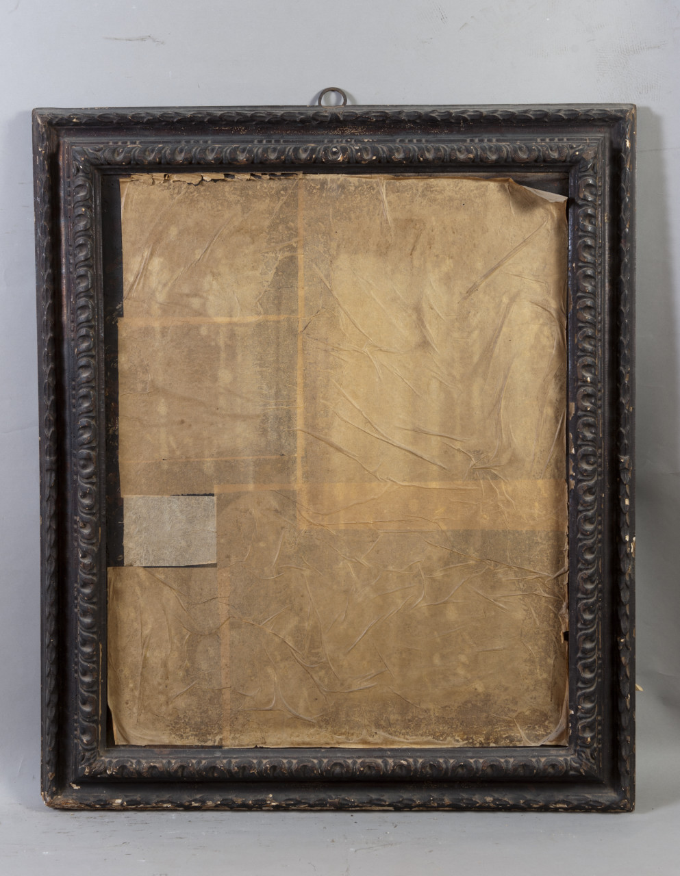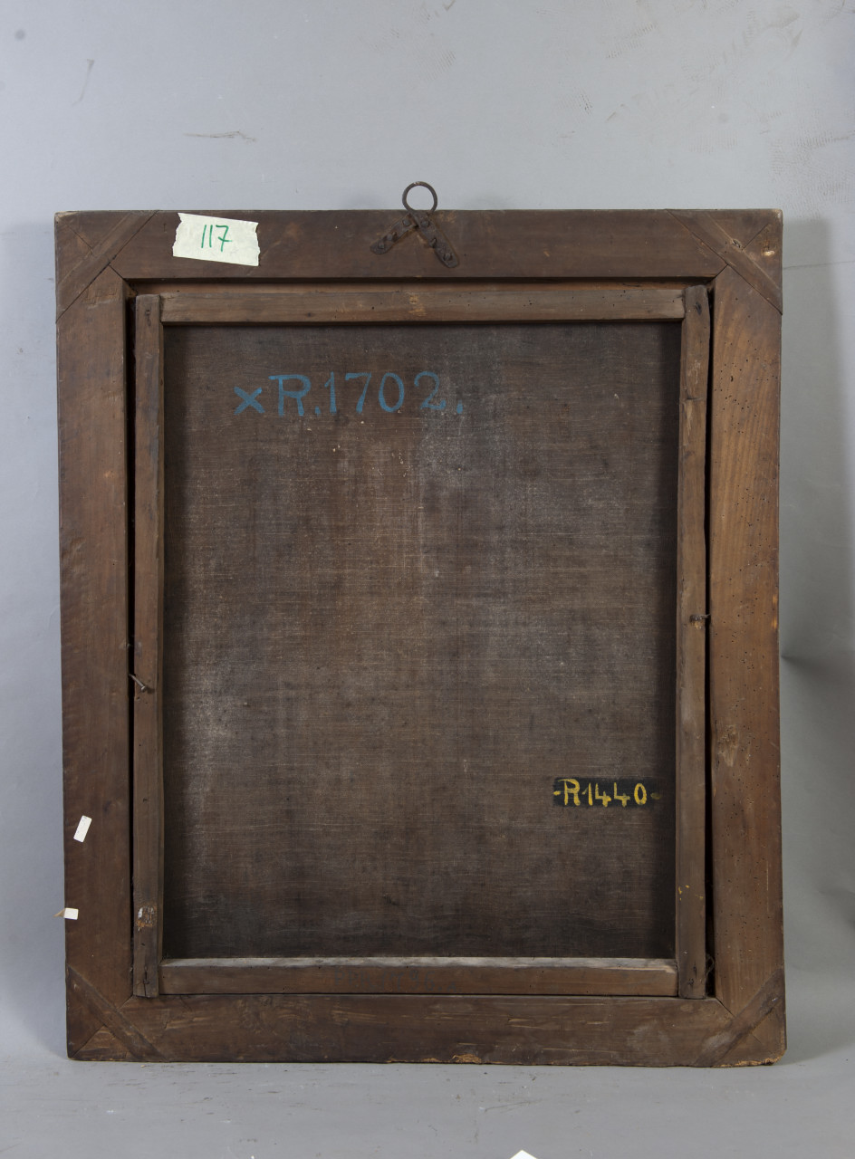 Il personaggio è rappresentato a mezzo busto. I caratteri della persona e del suo abbigliamento non sono leggibili poiché la tela è interamente coperta da velinatura. La tela è posta entro una cornice di formato e luce rettangolare in legno intagliato e verniciato. Tipologia a cassetta. Battuta liscia. Fascia interna intagliata con motivo a ovoli; fascia esterna con motivo a fogliette stilizzate sottili