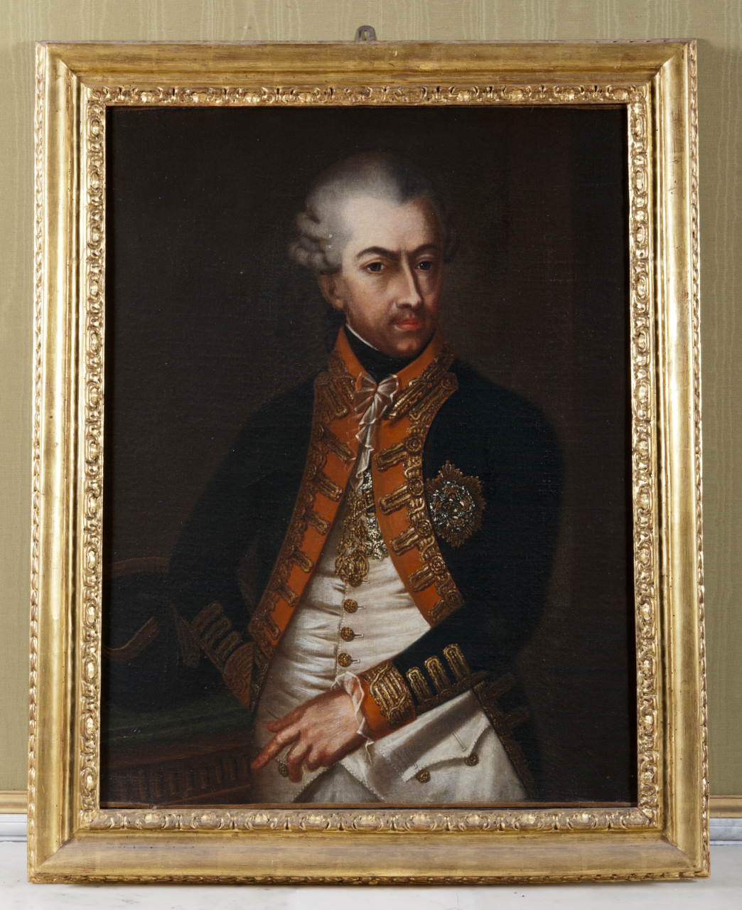 Il personaggio è rappresentato stante a mezzo busto, con taglio sotto al punto vita. Il copro è quasi frontale, il volto, di lieve tre quarti, e lo sguardo rivolto verso destra. Porta una parrucca con due file di boccoli al di sopra delle orecchie. Indossa camicia, jabot e marsina aperta dell’uniforme dell’esercito del Regno di Sardegna profilata da galloni in filo d’oro, presenti anche sul paramani. Sul petto è appuntata la placca dell’ordine della SS. Annunziata il cui pendente del collare compare al di sotto della marsina aperta che lascia vedere la sottomarsina di seta bianca. Una mano poggia sul fianco, l’altra, con l’indice sollevato, punta a un elemento collocato al di fuori della tela. In secondo piano, a sinistra, si intravede il piano di una console sulla quale poggia il tricorno. Sfondo neutro di colore scuro nel quale si intravede, sulla sinistra, una colonna poggiante su altro basamento. La tela è posta entro una cornice, in legno intagliato e dorato, di formato e luce rettangolare. Tipologia a gola. Fascia interna ornata da motivo a pelacette; fascia centrale liscia; fascia esterna perlinata