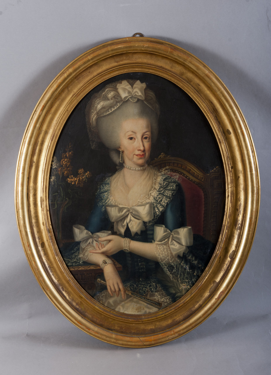 Il personaggio è rappresentato a mezzo busto, con taglio poco al di sotto del punto vita. Indossa una parrucca con capelli in varie sfumature di grigio parzialmente raccolti con sviluppo in altezza e in larghezza. Alcuni larghi boccoli scendono sino al collo. Al di sopra della capigliatura diadema e un ornato di nastri annodati e pizzi. La collo un giro di perle e alle orecchie orecchini a pendente di analogo materiale. Indossa un abito dallo scollo quadrato, arricchito da grosso fiocco e pizzi, analogamente alle maniche engageants. Il corpetto è adorno di nastri e pizzi. Sulle spalle è appoggiato in fisciù. Al polso porta due bracciali con quadruplo filo di perle e al centro miniatura con ritratto. Nella mano tiene un ventaglio chiuso. Una mano indica verso un vaso in vetro contenente un mazzo di narcisi dipinto piano di una console, scorciata sulla sinistra, sul quale è appoggiato l’altro braccio. Sfondo neutro di colore bruno. La tela è posta entro una cornice di profilo e luce ovale in legno intagliato e dorato. Tipologia a cassetta. Battuta liscia; fasce esterna e interna modanate, centrale liscia