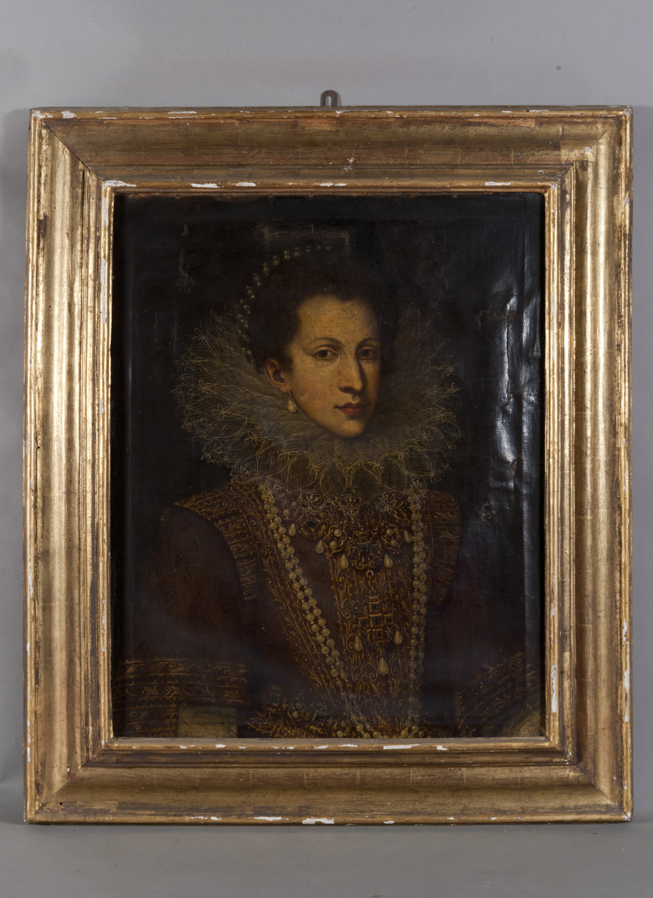 Il personaggio è rappresentato di lieve tre quarti, a mezzo busto. Lo sguardo rivolto verso l’osservatore. Porta i capelli raccolti con elaborata acconciatura a riccioli, ornata da una fascia con perle e pietre preziose. Dai lobi delle orecchie pendono orecchini a goccia. Una ampia gorgiera in pizzo incornicia il viso. Indossa una veste dal tessuto ornato da piccoli tagli con corpetto e soprammaniche arricchite da galloni finemente lavorati in filo d’oro. Al collo pendono una collana con pietre dure e un pendente a forma di croce ornato da pendenti a goccia, e un doppio giro di perle che scende sino al punto vita, a sua volta segnato dalla presenza di una cintura in materiali preziosi. Sfondo neutro sfumato nei toni del bruno e del grigio. La tela è posta entro una cornice di formato e luce rettangolare in legno intagliato e dorato. Tipologia a gola. Fasce modanate. Battuta liscia