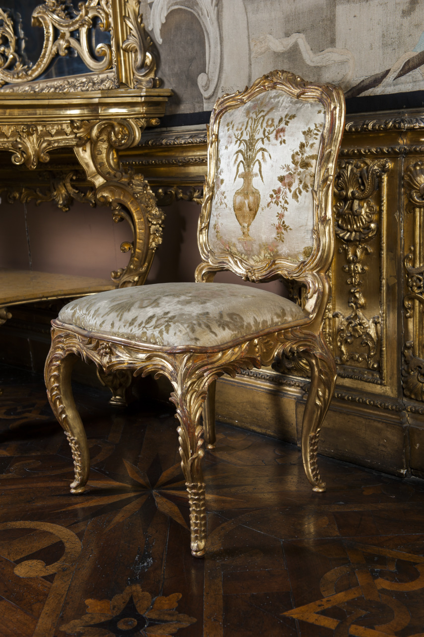 Sedia in legno intagliato e dorato con gambe a ramo di palma e fiore a mezzo di ciascun lato della seduta. Anche sullo schienale s'inerpicano fronde di palma. Il sedile e lo schienale sono imbottiti e ricoperti di velluto in seta ricamato a ghirlande di fiori variopinti, alcuni dei quali raccolti entro un vaso