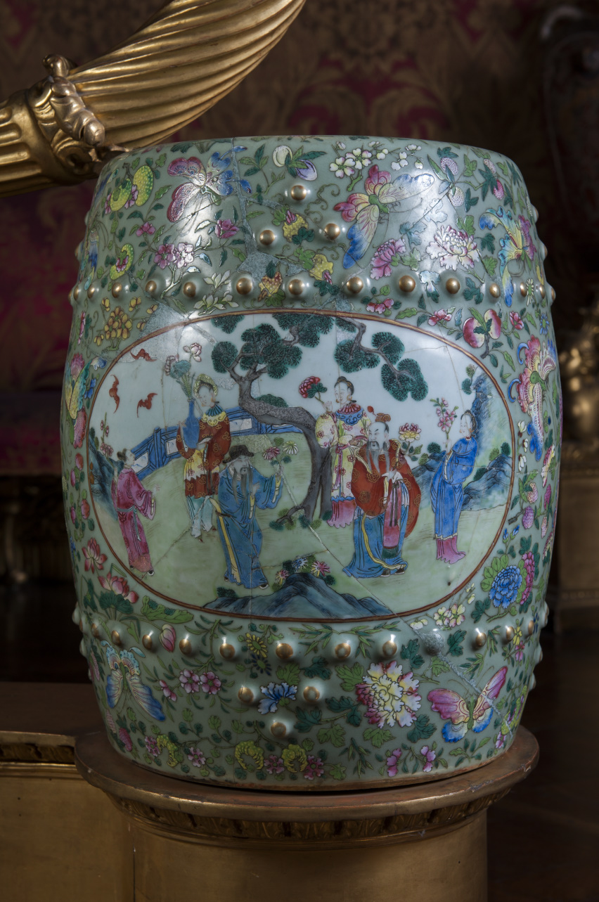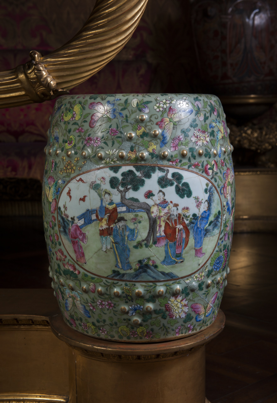 Vaso bruciaprofumi o sedile di forma cilindrica traforata sulla faccia superiore, con borchie in rilievo di colore dorato che circoscrivono e decorano la parte superiore e inferiore. La tinta di fondo è verde-azzurra e la decorazione a motivi floreali e farfalle. Al centro del corpo si apre una riserva ovale, entro la quale è rappresentato un giardino delimitato da un recinto basso di colore blu con specchiature marmoree e popolato da dignitari e concubine in abiti sontuosi, che recano tra le mani rami o vasi di fiori