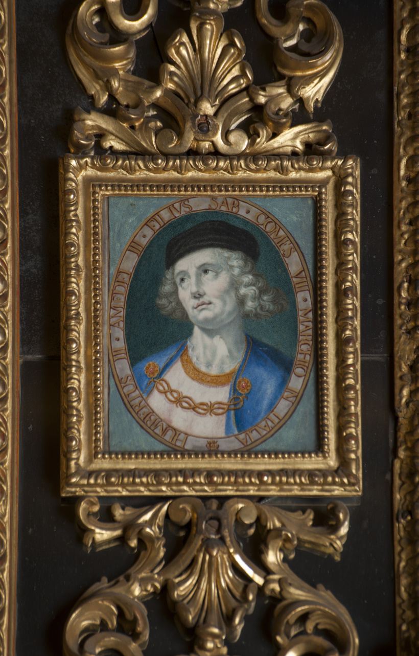 Cornice rettangolare in legno intagliato e dorato; il listello esterno reca un motivo decorativo ripetitivo a baccellatura, il listello più interno un motivo a piccole perle. La cornice racchiude una miniatura su smalto raffigurante il conte Umberto III