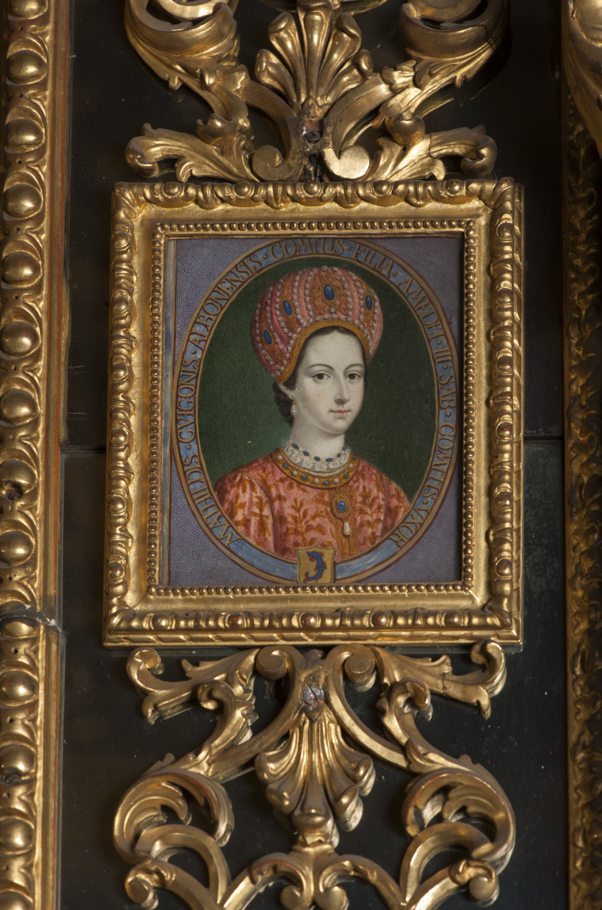 Cornice rettangolare in legno intagliato e dorato; il listello esterno reca un motivo decorativo ripetitivo a baccellatura, il listello più interno un motivo a piccole perle. La cornice racchiude una miniatura su smalto raffigurante Matilde d'Albon