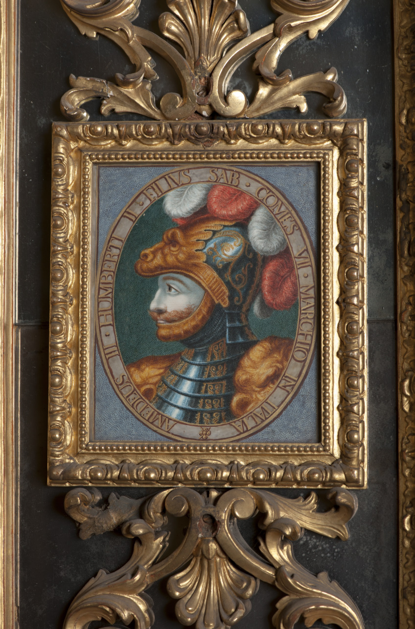 Cornice rettangolare in legno intagliato e dorato; il listello esterno reca un motivo decorativo ripetitivo a baccellatura, il listello più interno un motivo a piccole perle. La cornice racchiude una miniatura su smalto raffigurante il conte Amedeo III