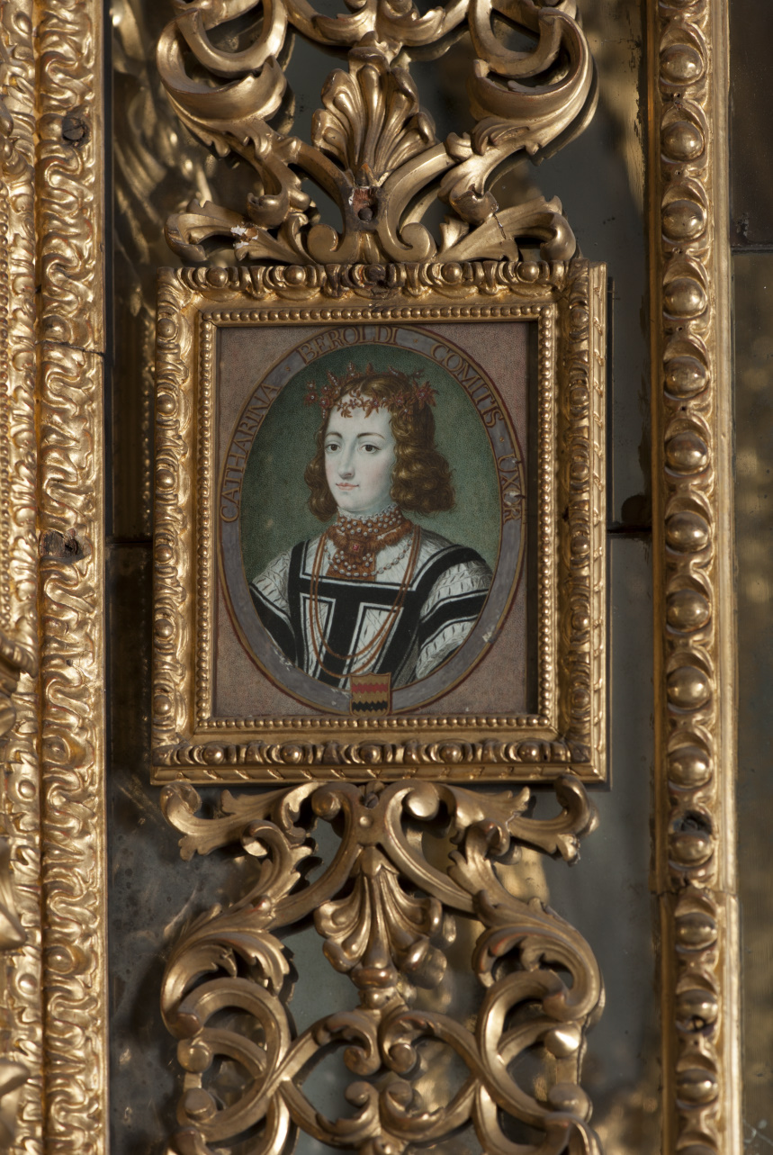 Cornice rettangolare in legno intagliato e dorato; il listello esterno reca un motivo decorativo ripetitivo a baccellatura, il listello più interno un motivo a piccole perle. La cornice racchiude una miniatura su smalto raffigurante Caterina moglie del conte Beroldo
