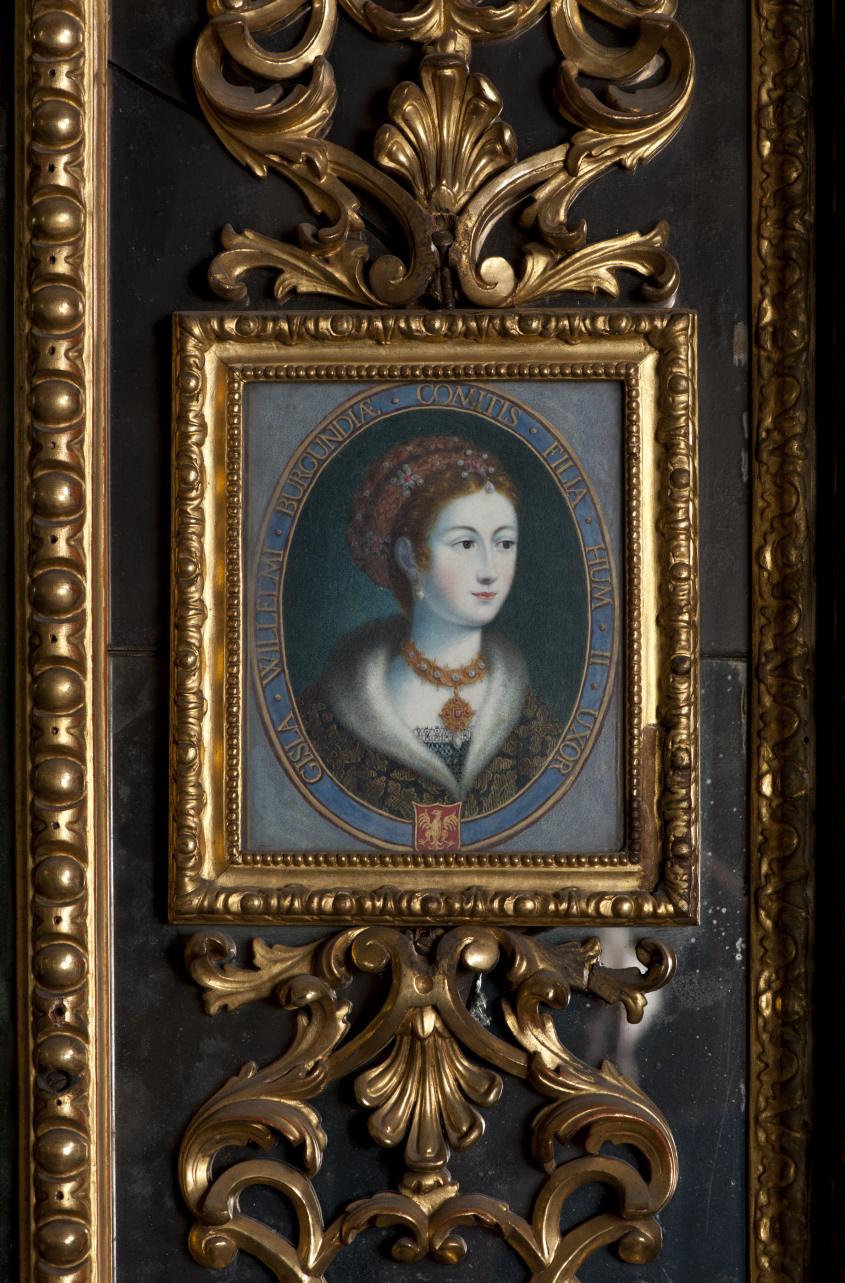 Cornice rettangolare in legno intagliato e dorato; il listello esterno reca un motivo decorativo ripetitivo a baccellatura, il listello più interno un motivo a piccole perle. La cornice racchiude una miniatura su smalto raffigurante Gisla di Borgogna
