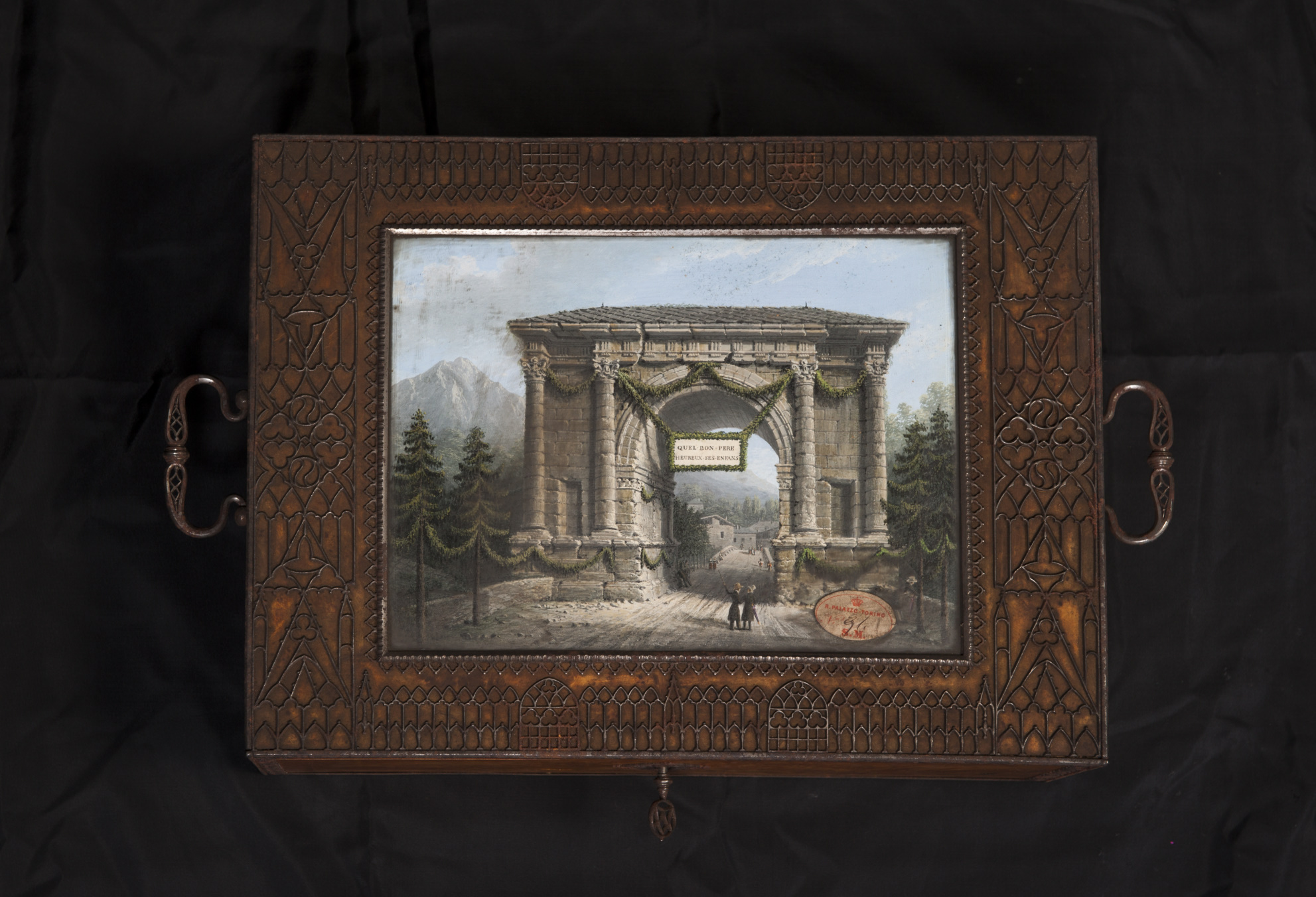 Contenitore di forma parallelepipeda. Le superfici esterne sono impiallacciate in radica di noce. In corrispondenza degli spigoli del cofanetto e del lato del coperchio è applicata una cornice metallica con motivo continuo ad archetti. Nel punto mediano dei due lati minori sono montate due maniglie in metallo, di formato curvilineo. Sulla fronte, al centro, serratura con chiave. Sul coperchio è applicata una cornice in metallo a traforo ornata da motivi neogotici. Nel vano rettangolare centrale è incassata una miniatura su carta acquerellata. Vi è dipinto un arco di epoca romana, ornato da festoni vegetali da cui pende una cartella centrale con iscrizione. Sullo sfondo, a destra, un paesaggio montano; al centro una veduta in prospettiva di una strada con alcune abitazioni. Abeti da ambo i lati fanno da quinta alla scena. Due figure maschili con redingote, tuba e bastone osservano il monumento commentando tra loro