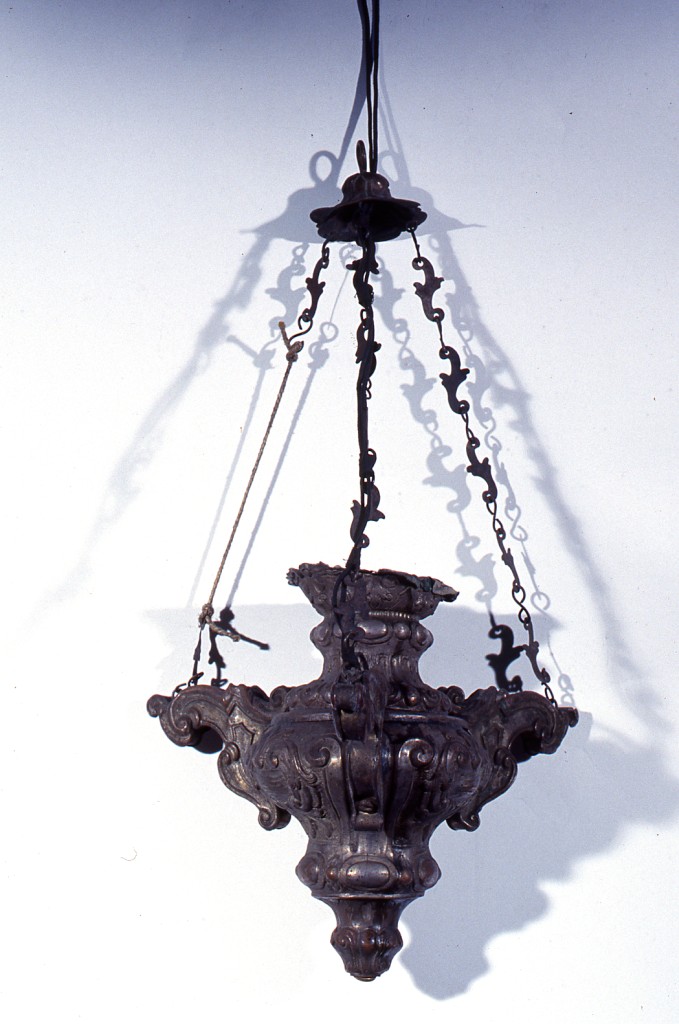 Lampada costituita da coppa sagomata decorata da motivi vegetali e geometrici; tre manici, tre catenelle di sospensione con maglie in lamine a forma di S, e piattello di raccordo delle catene
