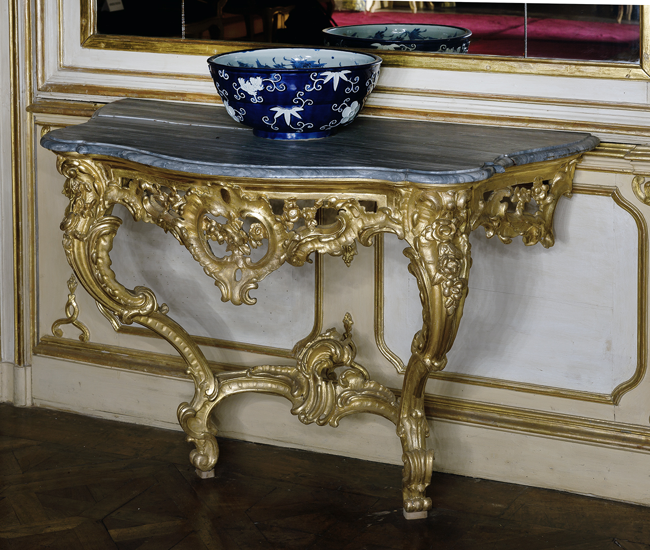 - NOTIZIE STORICO CRITICHE L’attuale Sala Bleu, sin dalle sue origini settecentesche, è stata destinata a camera d’udienza o di ricevimento. La sala subì due riallestimenti (il primo, tra la fine dell’Ottocento e i primi anni del Novecento e, il secondo, successivamente al passaggio allo Stato italiano, negli anni di Soprintendenza di Umberto Chierici); riallestimenti che, come in altri casi, previdero il trasferimento di arredi da altre zone del castello. La console in oggetto, in pendant con l'altra presente nella sala (scheda n. 0100402354) costituisce una rara testimonianza degli arredi disegnati personalmente dall’architetto ducale Ignazio Birago di Borgaro, il quale citò in maniera letterale l’autorevole modello di Filippo Juvarra (Vinardi 1990, p. 456, nota 22). Sebbene, dunque, il disegno e l'esecuzione risalgano al terzo quarto del Settecento, le due console non furono collocate in questa sala che nei primi del XX secolo, durante la residenza dei secondi duchi di Genova (Ragusa 1995, p. 47)