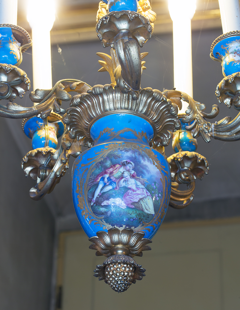 Lampadario a cinque luci in porcellana dura di Sèvres a fondo azzurro che, nel corpo principale, è decorato con due cartelle dorate di gusto rocaille ove all'interno sono rispettivamente raffigurate una scenetta galante e una pastorale. Dal corpo centrale si dipartono cinque bracci in bronzo dorato a volute, fiori e foglie d'acanto, che terminano in cinque vani porta candela, ciascuno dei quali è decorato con piccoli medaglioni dorati entro i quali sono rappresentati mazzolini di fiori su fondo bianco