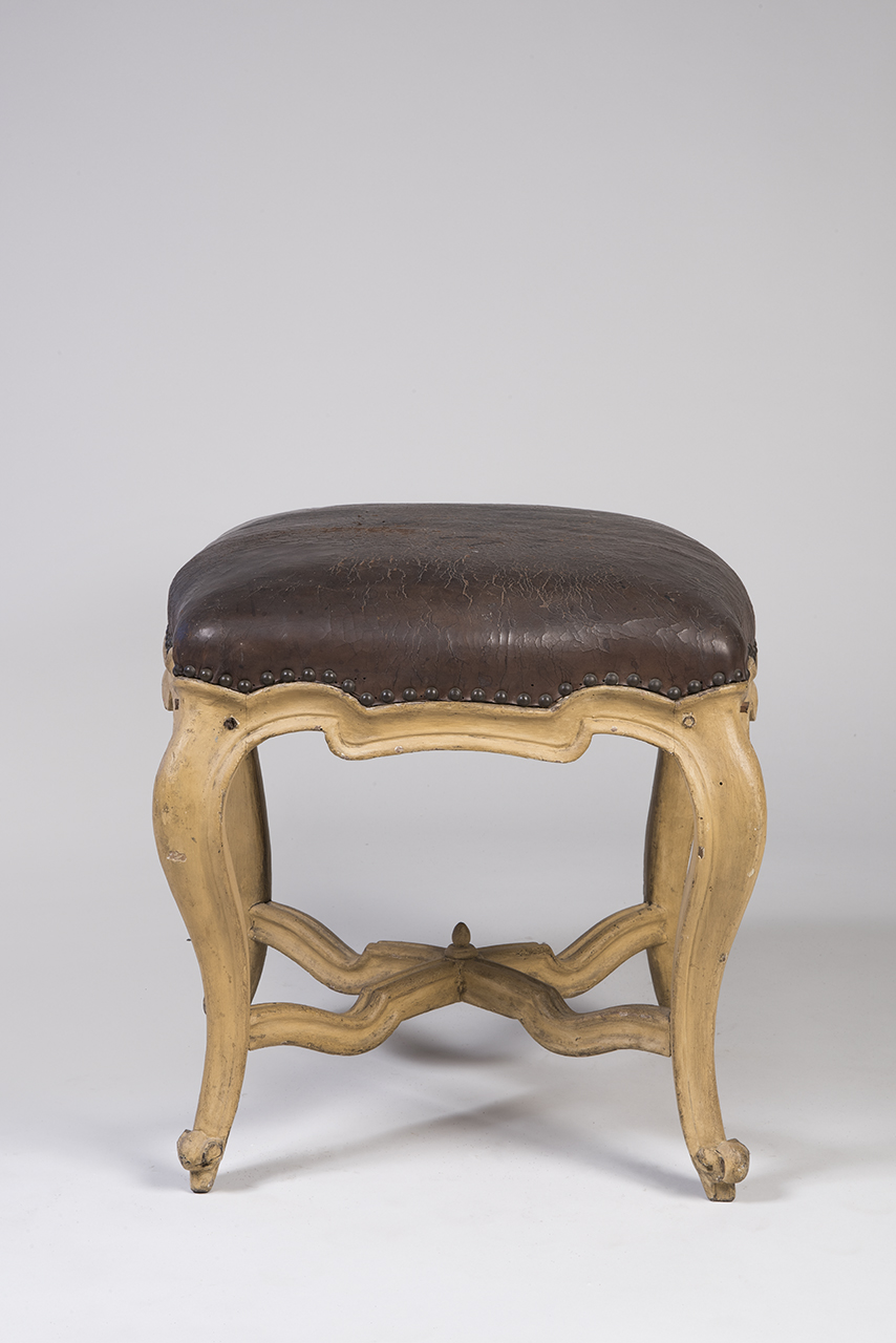 Sgabello in legno di noce dipinto di giallo con quattro gambe a voluta collegate da traversa a crociera; imbottito e coperto in pelle marrone