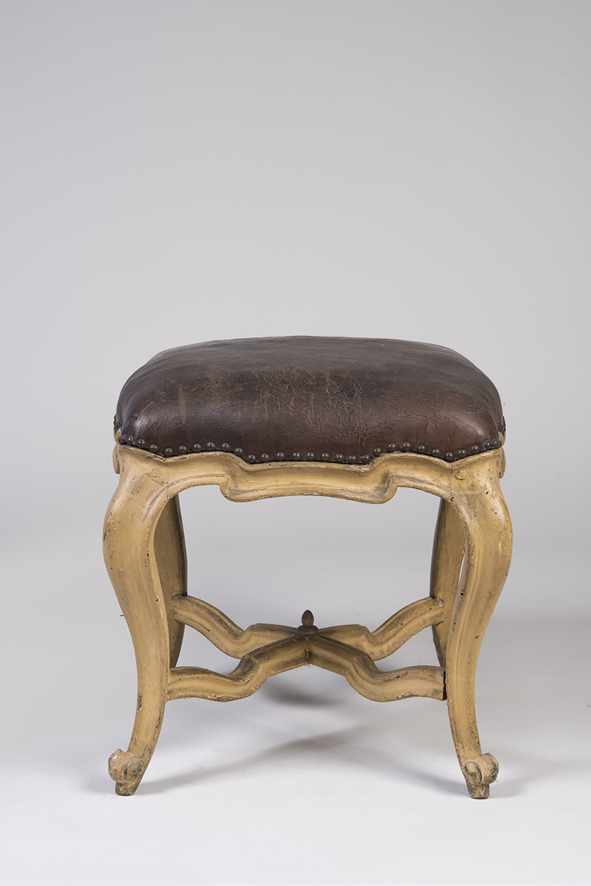 Sgabello in legno noce dipinto di giallo con quattro gambe a voluta collegate da traversa a crociera; imbottito e coperto in pelle marrone