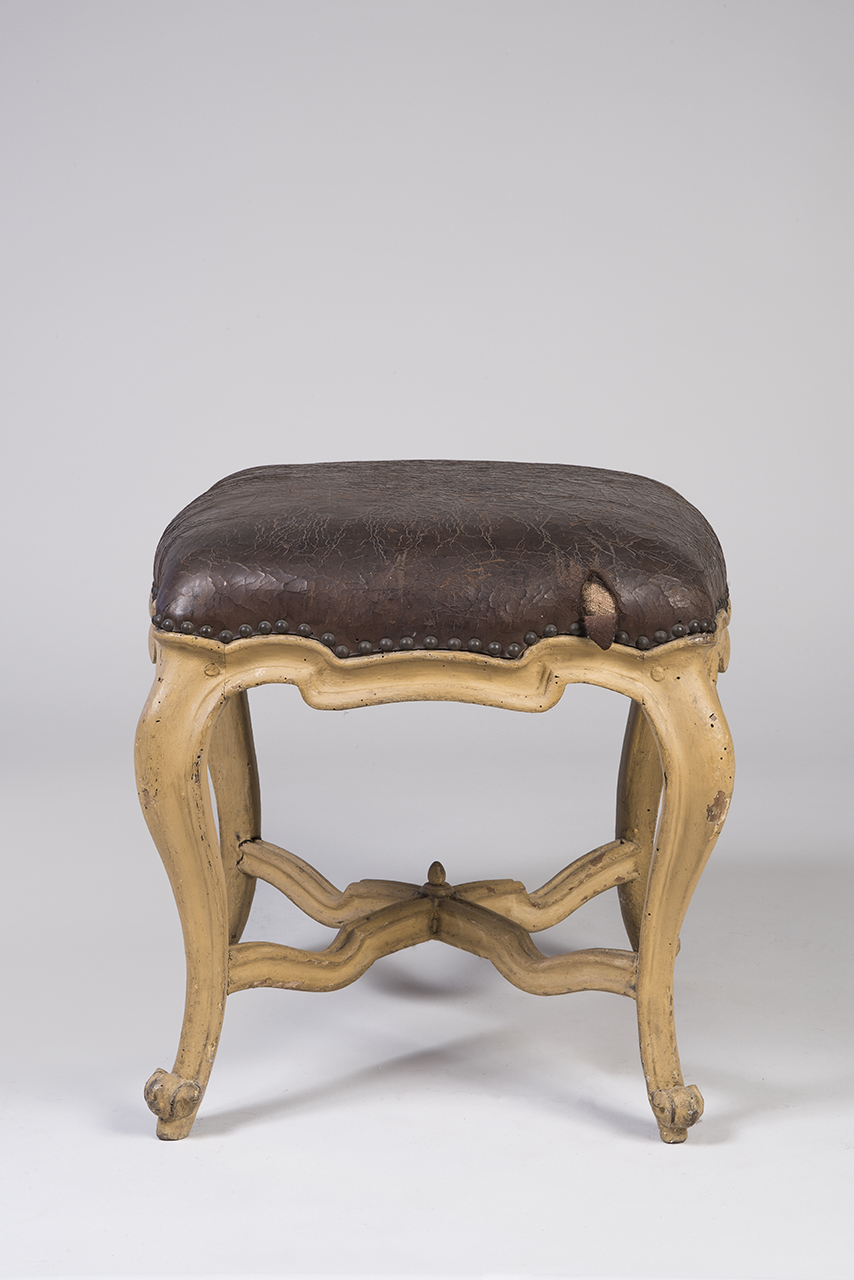 Sgabello in legno di noce dipinto di giallo con quattro gambe a voluta collegate da traversa a crociera; imbottito e coperto in pelle marrone