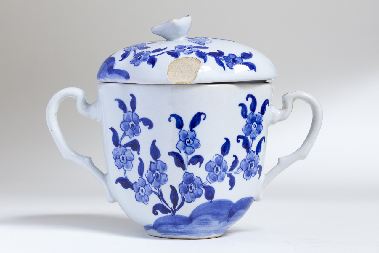 Tazza in ceramica bianca dotata di due manici sagomati per lato e da un coperchio con presa sulla sommità. Decorata con disegni di fiori e foglie di colore azzurro-blu sulla fascia centrale e sul coperchio. Sulla tazza, circondato dai racemi, è dipinto una stemma sormontato da una corona da cui si diparte un animale, forse un orso