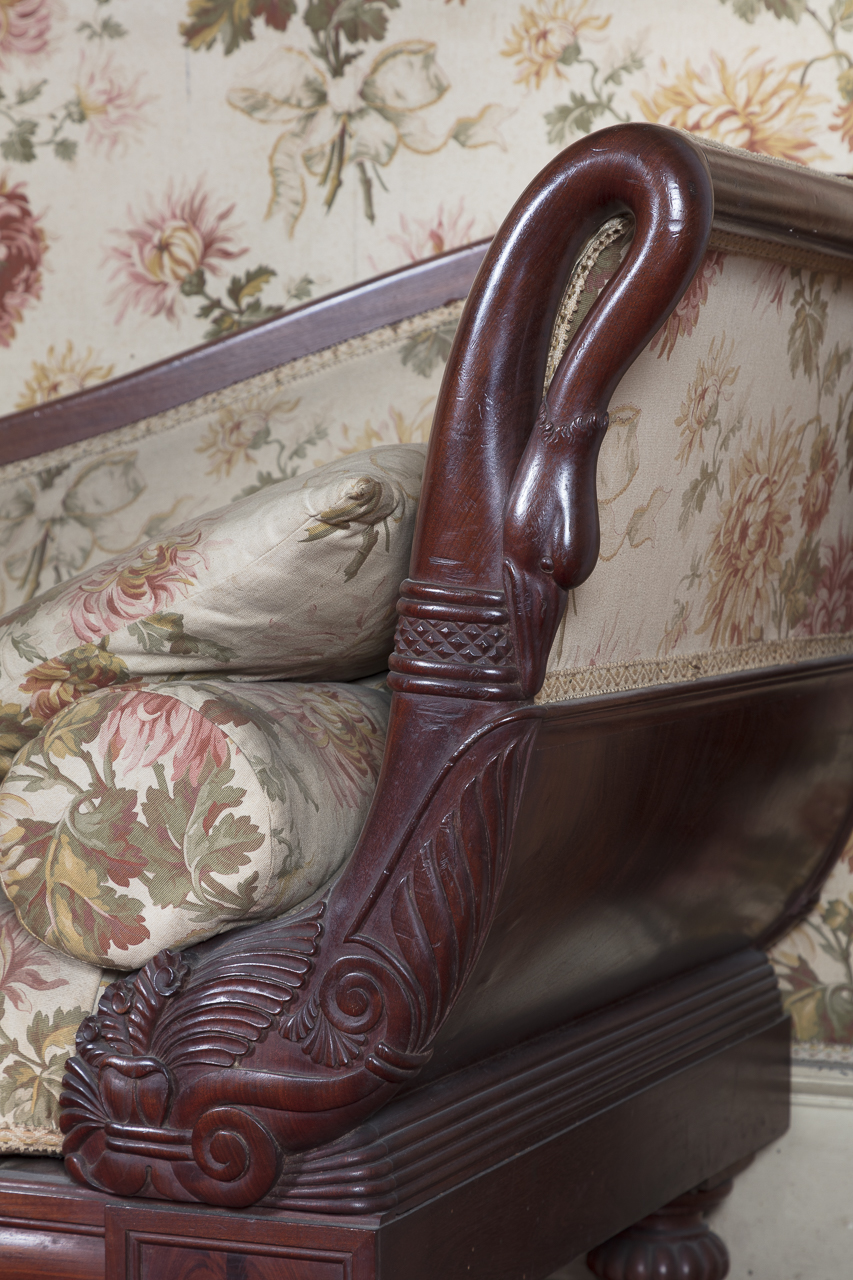 Dormeuse di mogano intagliato con motivi a palmette; l'appoggio è a forma di collo di cigno e le gambe sono a tortiglione; imbottita e coperta di cretonne con disegni a foglie e mazzi di grisantemi policromi su fondo crema. Corredata di due cuscini con medesimo rivestimento