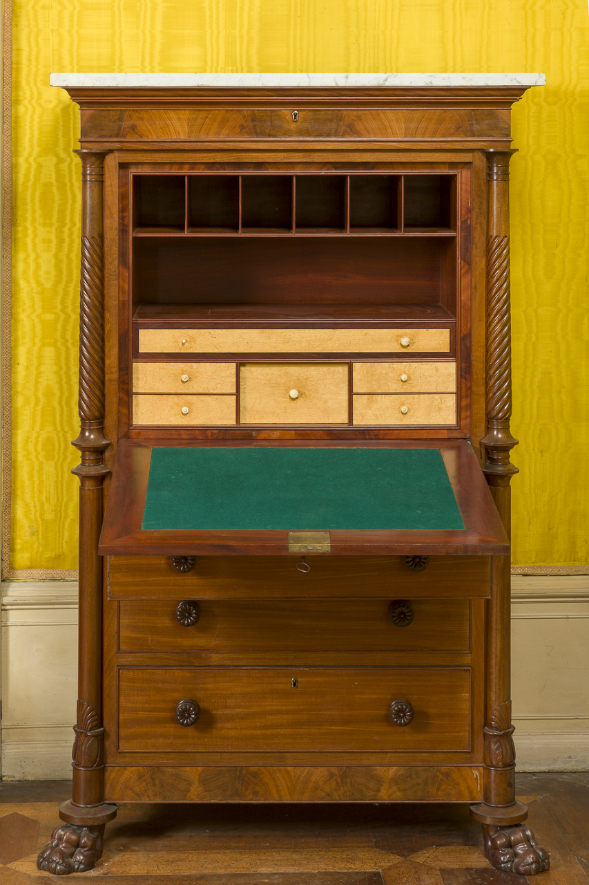 Stipo con ripiano di marmo bianco. Dotato di tre cassetti e una ribalta all'interno di cui vi sono sei cassetti di legno chiaro e sei scomparti nella parte superiore con pomelli di madreperla. Decorato con due colonne a tortiglione, pomelli dei cassetti esterni a forma di fiore e piedi anteriori a forma di zampa di leone