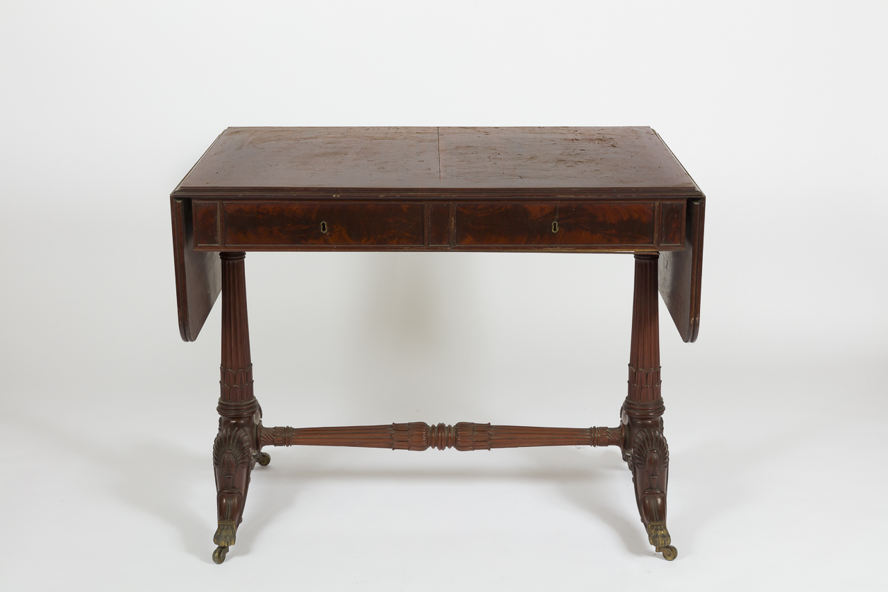 Tavolo in mogano intagliato con motivi a palmette, presenta due cassetti e ali pieghevoli ai fianchi; le colonnine di supporto, lavorate in parte a tortiglione e in parte scanalate, sono collegate da traversa analoga; i piedi sono ricurvi e terminanti a zampa di leone in bronzo dorato muniti di rotellei
