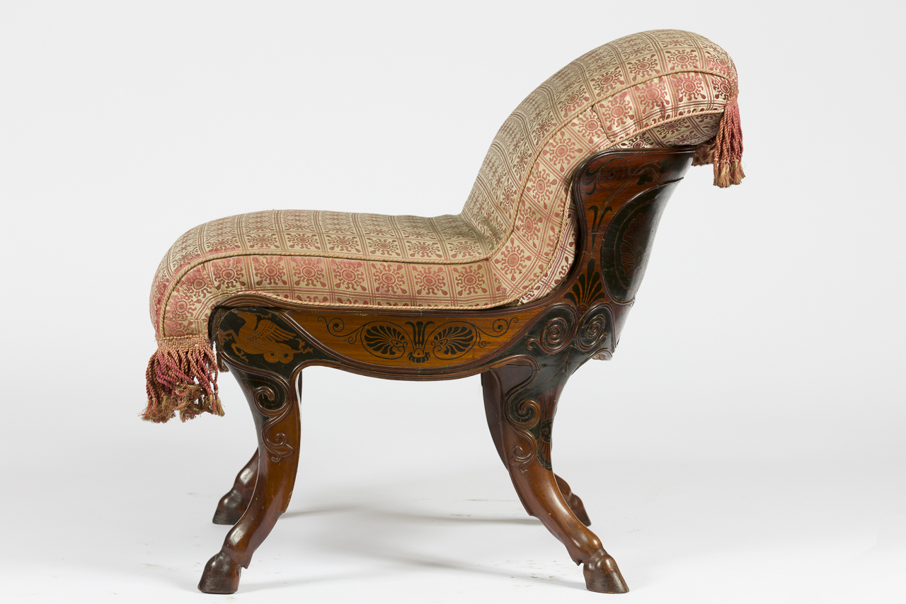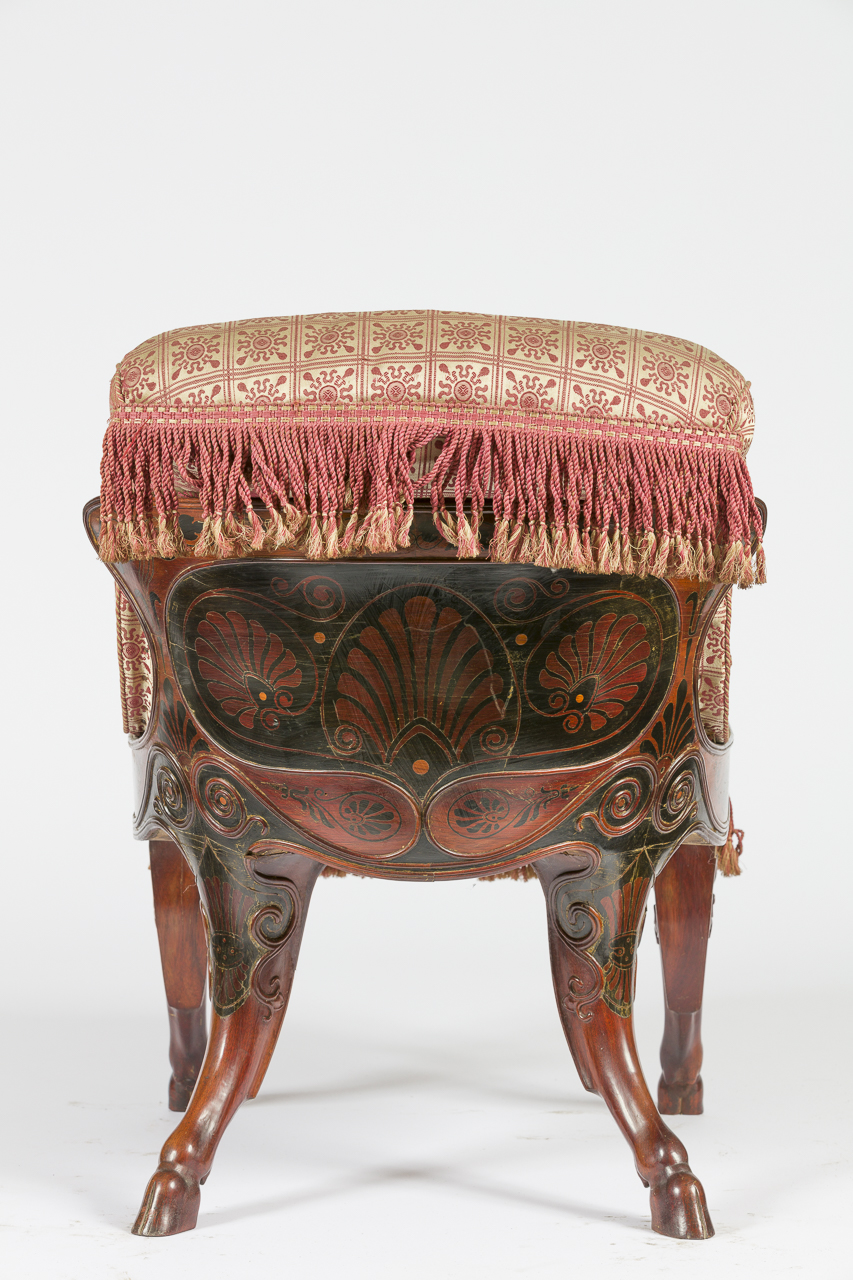 Sedia in legno intarsiato con quattro zampe caprine. Sui lati il decoro intarsiato mostra un leone alato con coda in forma di drago e palmette. Alcune volute intagliate scendono da qui fino all’altezza delle gambe. Anche sul retro, lo schienale è caratterizzato da un decoro intarsiato a tre palmette. L’imbottitura di schienale e seduta è di colore oro e rosso, con un decoro caratterizzato dalla ripetizione di piccoli soli stilizzati entro piccoli riquadri. L’imbottitura si chiude con frange dei medesimi colori sia sulla parte frontale che sul retro. Il sedile imbottito è mobile