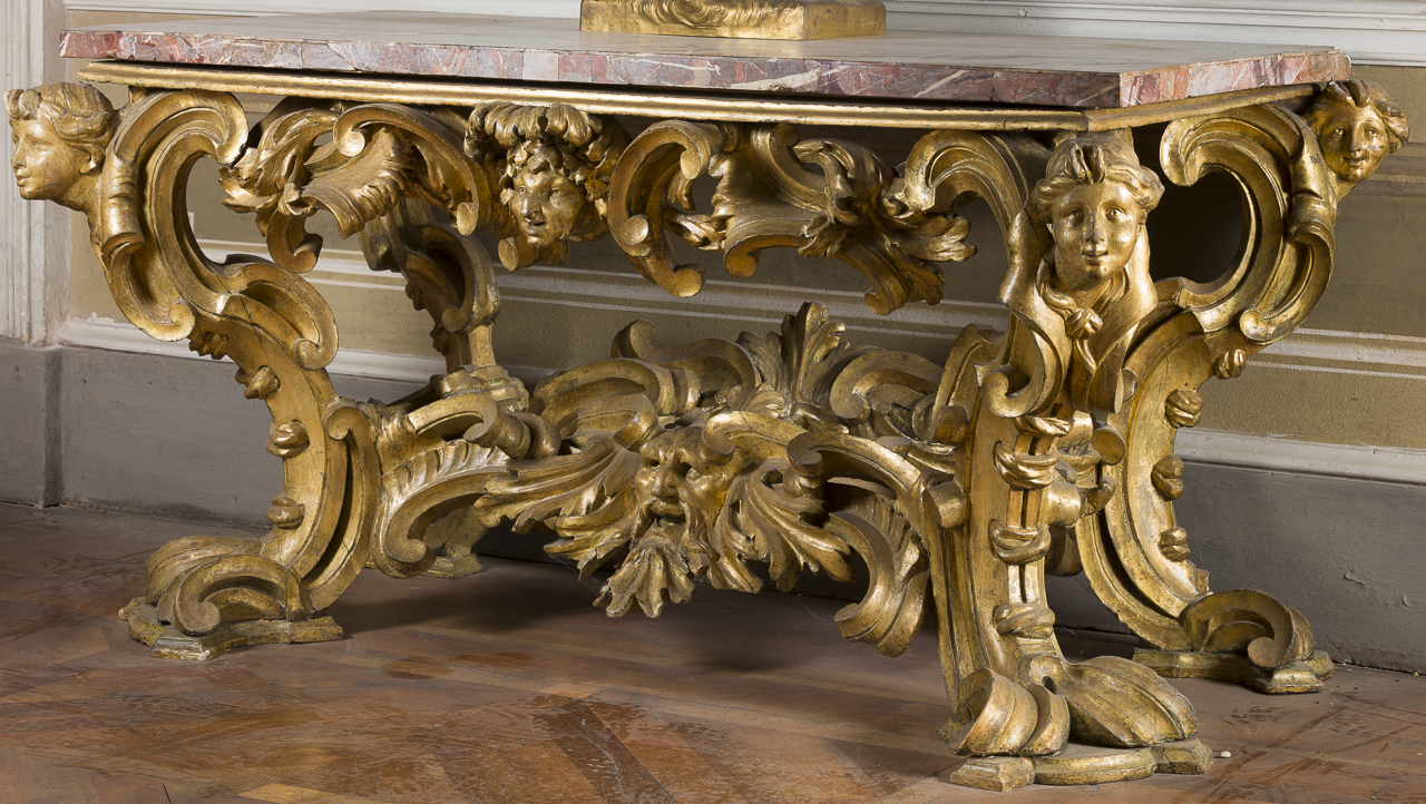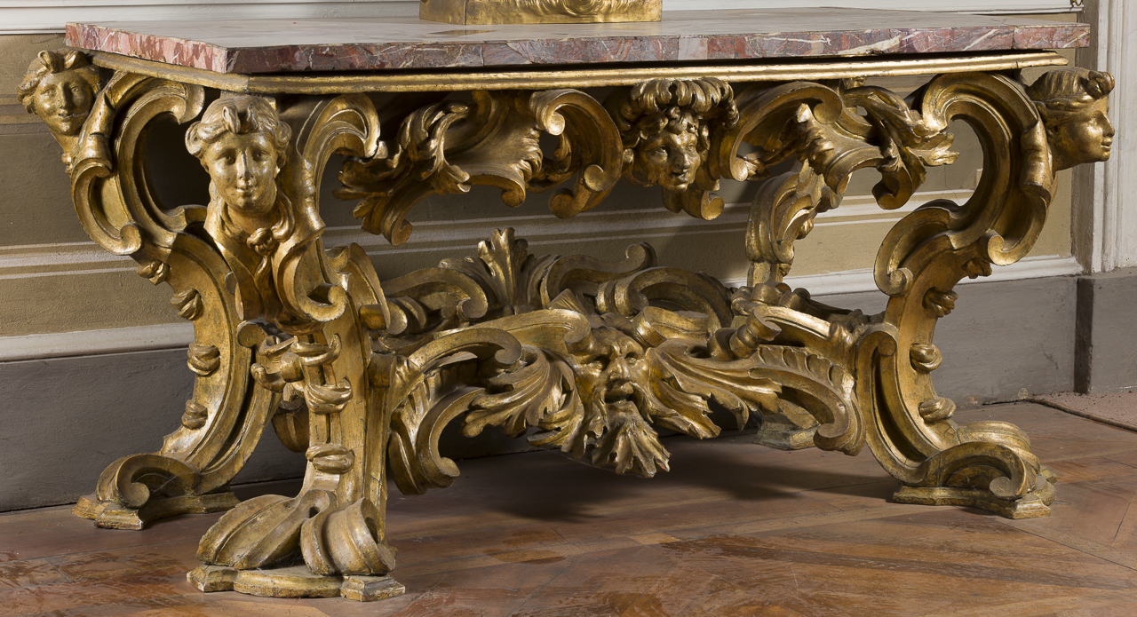 Il piano in marmo di colore grigio e rosa posa su quattro gambe composte da doppie volute. Sono unite da un raccordo mistilineo composto di foglie e volute che, al centro, ospita due mascheroni di uomini barbuti. Il tema della testa umana compare anche al centro del decoro intagliato (con foglie e volute) che sostiene il piano sulla parte frontale. Al centro di questa zona è infatti scolpito un volto di fauno. Sui quattro angoli, in corrispondenza della parte terminale delle gambe sono scolpite invece teste femminili. Quelle della parte frontale sono più definite e di qualità più elevata