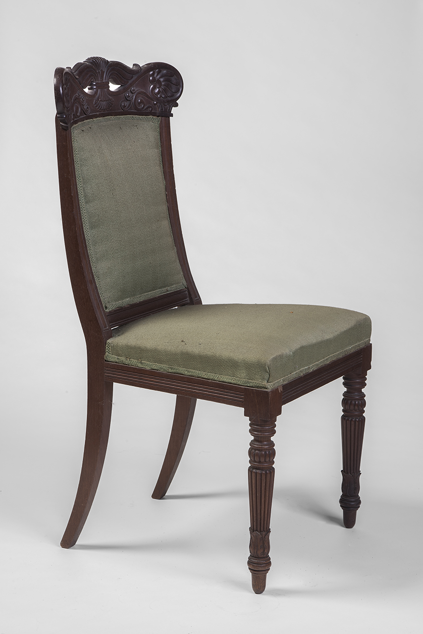 Sedia a quattro gambe. Quelle anteriori, a colonnina scanalata, si dipartono da un piede a collarino e coroncina di foglie d'acanto. Quelle posteriori sono lisce. Sedile e schienale sono imbottiti e rivestiti di seta mista a tela di colore verde. Sulla traversa superiore si sviluppa un intaglio costituito da una palmetta centrale da cui si dipartono volute e altre due palmette